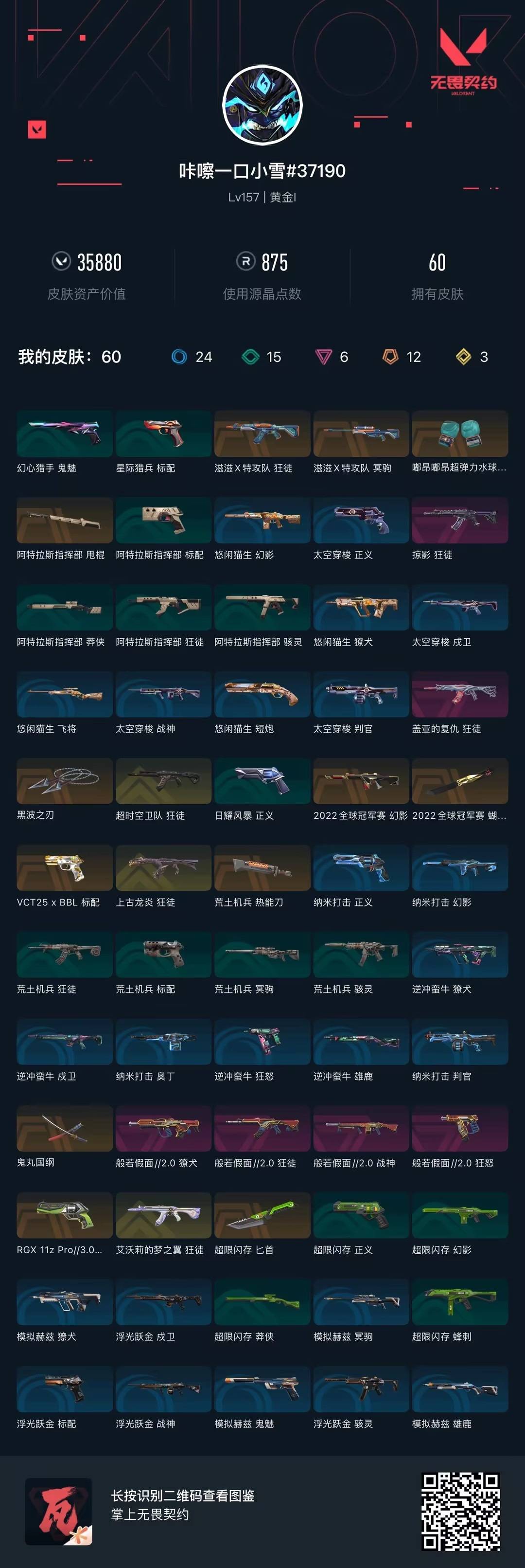 [16367592]12橙皮 3金皮 6紫皮 60皮肤 27英雄 107卡面 875已用源晶 黄金段位 【亮点皮肤】幻影-2022全球冠军赛蝴蝶刀-2022全球冠军赛 【套装】般若假面//2.0套装滋滋x特工队2022全球冠军赛 【近战武器皮肤】匕首-超限闪存阿特拉斯指挥部鬼丸国纲荒土机兵热能刀嘟昂嘟昂超弹力水球拳套黑波之刃 【佩呛皮肤】标配-vct25xbbl狂怒-般若假面//2.0正义-rgx 11z pro 3.0 【步呛皮肤】狂徒-上古龙炎獠犬-般若假面//2.0狂徒-般若假面//2.0狂徒-掠影狂徒-滋滋x特攻队狂徒-超时空卫队狂徒-艾沃莉的梦之翼狂徒-盖亚的复仇 【狙击呛皮肤】冥驹-滋滋x特攻队 【机呛皮肤】战神-般若假面//2.0 【挂饰】袖珍捷风挂饰神中神挂饰v26第一幕纪念币 挂饰2022全球冠军赛弯檐帽挂饰vctxbbl挂饰双面黑猫挂饰双城之战小蛋糕挂饰终章ko小金人挂饰h2-oh!挂饰