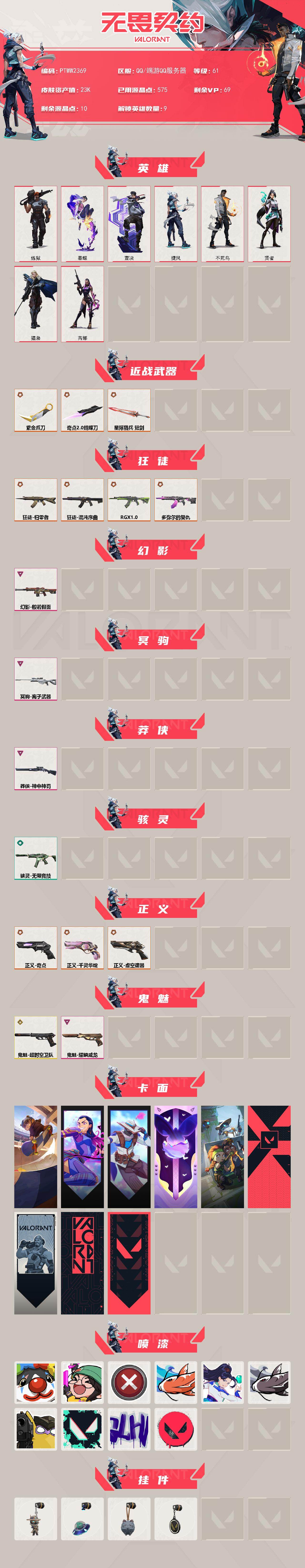【ptww2369】终极11/传奇1/卓越4/皮肤46/等级61/段位:黄金/炼狱/暮蝶/壹决/捷风/不死鸟/贤者/猎枭/芮娜/奇点//2.0-蝴蝶刀/紫金爪刀/近战武器-星际猎兵 短剑/归零者-狂徒/混沌序曲-狂徒/狂徒-rgx 11z pro/狂徒-多弥尔的复仇/般若假面-幻影/冥驹-离子武器/莽侠-神中神罚/骇灵-无限竞技/奇点-正义/正义-千灵华绽/正义-虚空遗器/鬼魅-超时