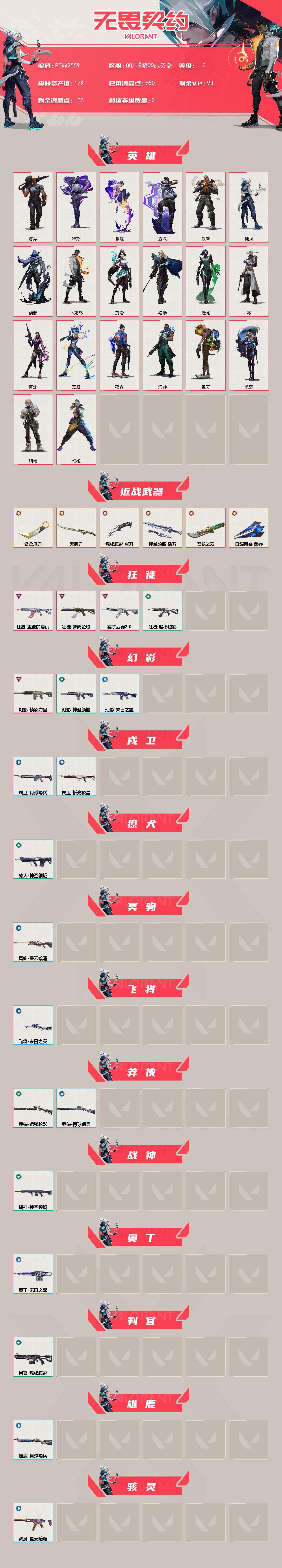 【英雄】:幻棱,炼狱,维斯,暮蝶,壹决,铁臂,捷风,幽影,不死鸟,贤者,猎枭,蝰蛇,零,芮娜,霓虹,夜露,海神,盖可,黑梦,钢锁 【近战武器】:近战武器-5周年//公测重制版 苍龙之刃,近战武器-紫金爪刀,近战武器-天御刀,近战武器-诡秘蛇影 军刀,近战武器-神圣领域 战刀,近战武器-日耀风暴 遗器 【狂徒】:狂徒-盖亚的复仇,狂徒-紫阙金琅,狂徒-离子武器//2.0,狂徒-诡秘蛇影 【幻影】