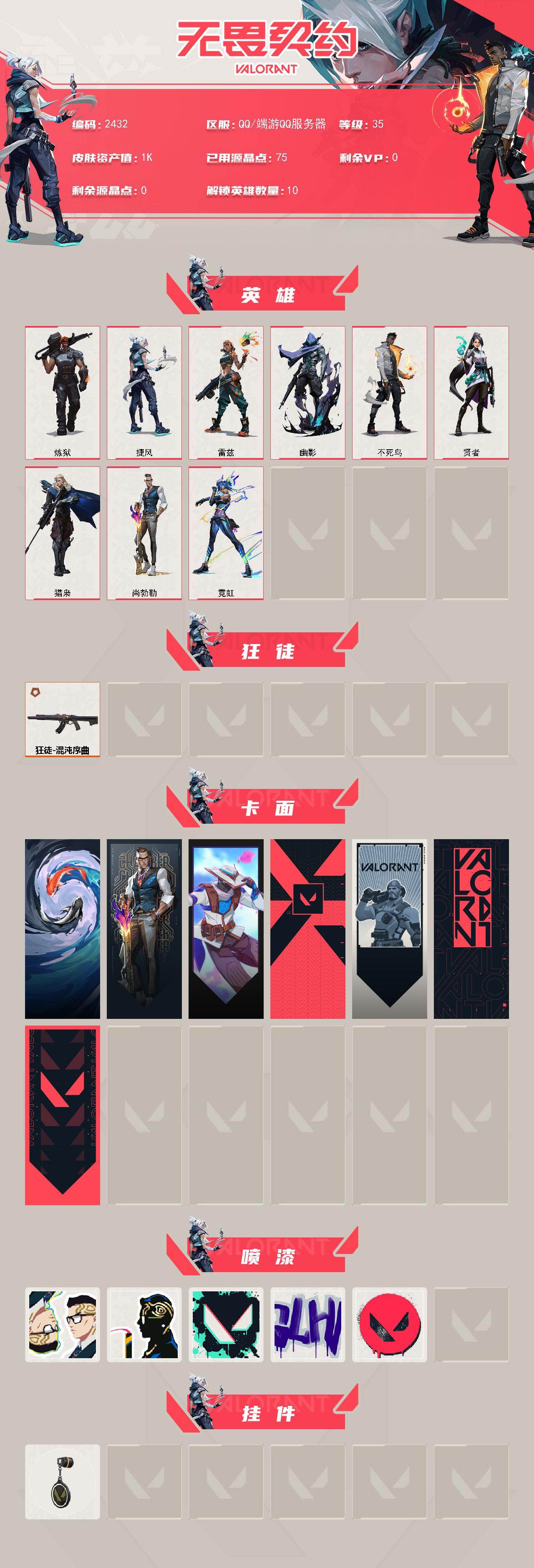 [16368384]【英雄】:炼狱,捷风,雷兹,幽影,不死鸟,贤者,猎枭,尚勃勒,霓虹 【狂徒】:狂徒-混沌序曲 【卡面】:红鳞松叶 卡面,无畏契约:尚勃勒 卡面,无畏契约go!第一卷:零 卡面,代号红色 卡面,新兵报到 卡面,v契约 卡面,无畏契约 卡面 【喷漆】:分身有术 喷漆,致命优雅 喷漆,胜利属于无畏契约 喷漆,glhf 喷漆,无畏契约 喷漆 【挂饰】:无畏契约 纪念币 挂饰