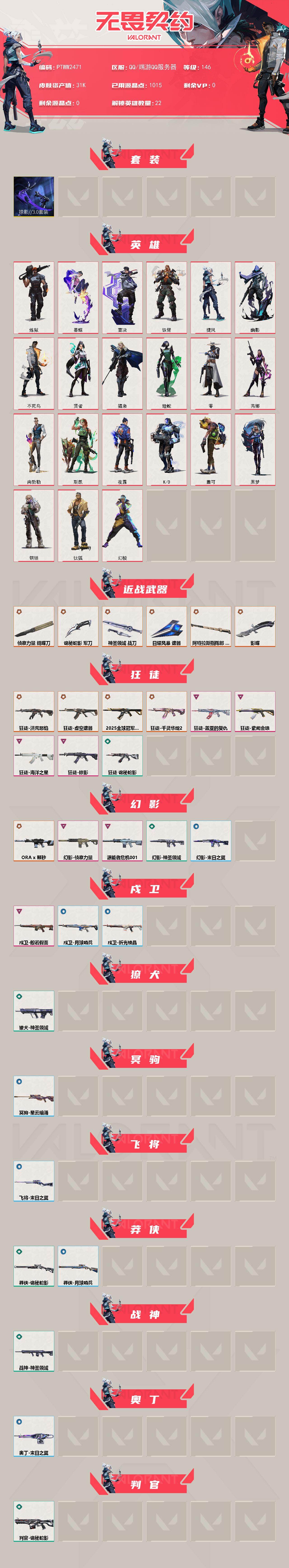【ptww2471】终极12/传奇2/卓越8/皮肤81/等级146/段位:黄金/掠影//3.0套装/幻棱/炼狱/暮蝶/钛狐/壹决/铁臂/捷风/幽影/不死鸟/贤者/猎枭/蝰蛇/零/芮娜/尚勃勒/斯凯/夜露/k/o/盖可/黑梦/钢锁/近战武器-影蝶/侦察力量-蝴蝶刀/近战武器-诡秘蛇影 军刀/近战武器-神圣领域 战刀/近战武器-日耀风暴 遗器/近战武器-阿特拉斯指挥部 甩棍/狂徒-202