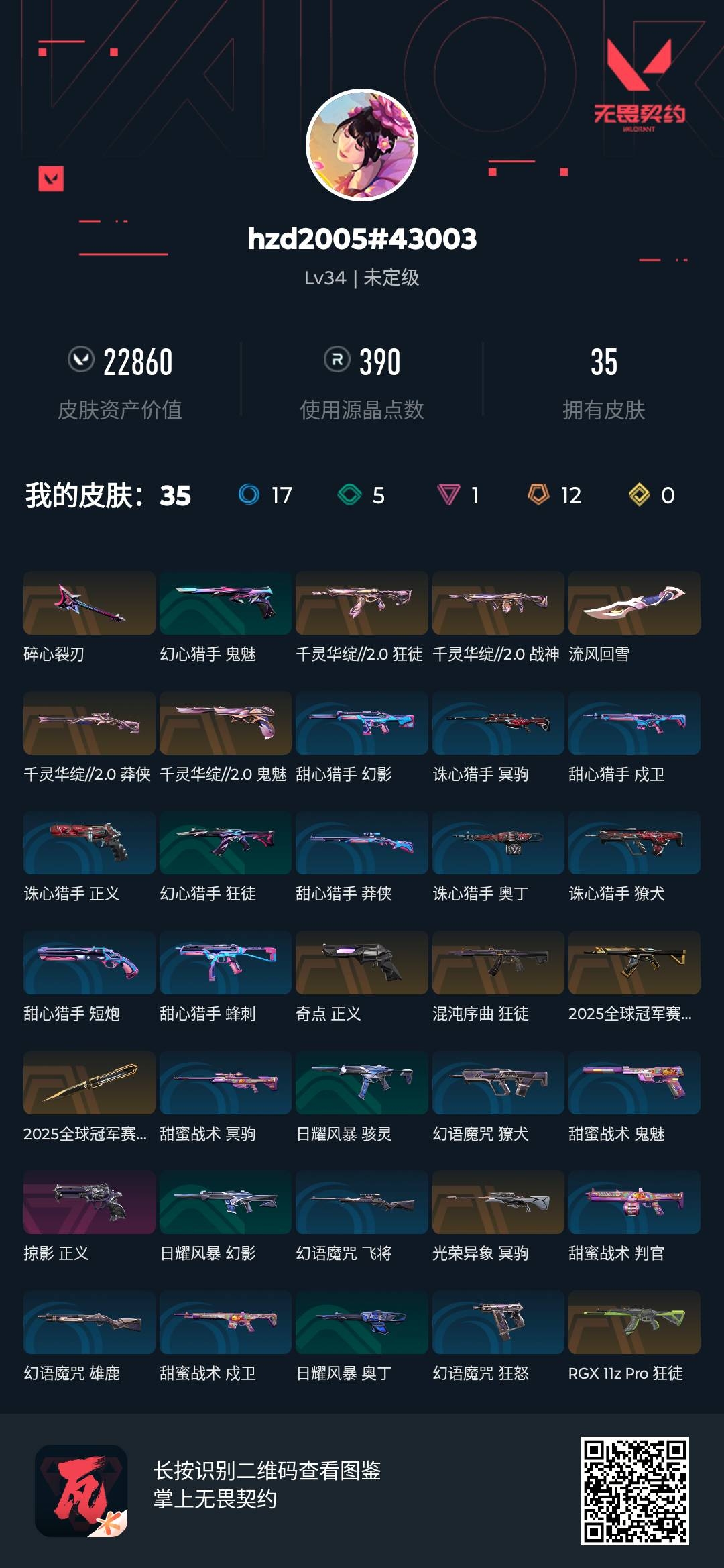 [15820960]q192659 (千灵华绽//2.0套装/2025全球冠军赛套装)无畏契约/等级34/未定级/英雄16/皮肤35/资产22860/已使用r点390/剩余r点0/千灵华绽//2.0-狂徒,千灵华绽//2.0-战神,千灵华绽//2.0-莽侠,千灵华绽//2.0-鬼魅,流风回雪,2025全球冠军赛-狂徒,2025全球冠军赛-蝴蝶刀,碎心裂刃,rgx-11z-pro-狂徒,混沌序曲-狂徒,光荣异象-冥驹,奇点-正义,掠影-正义