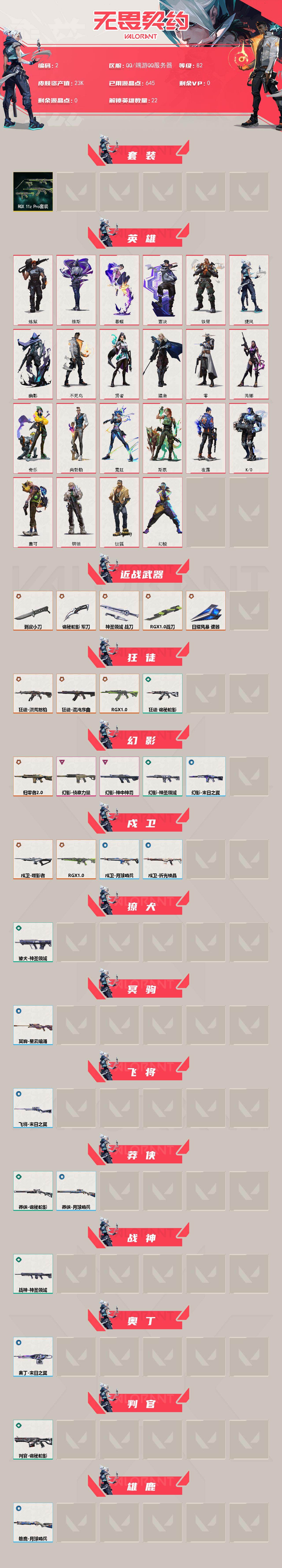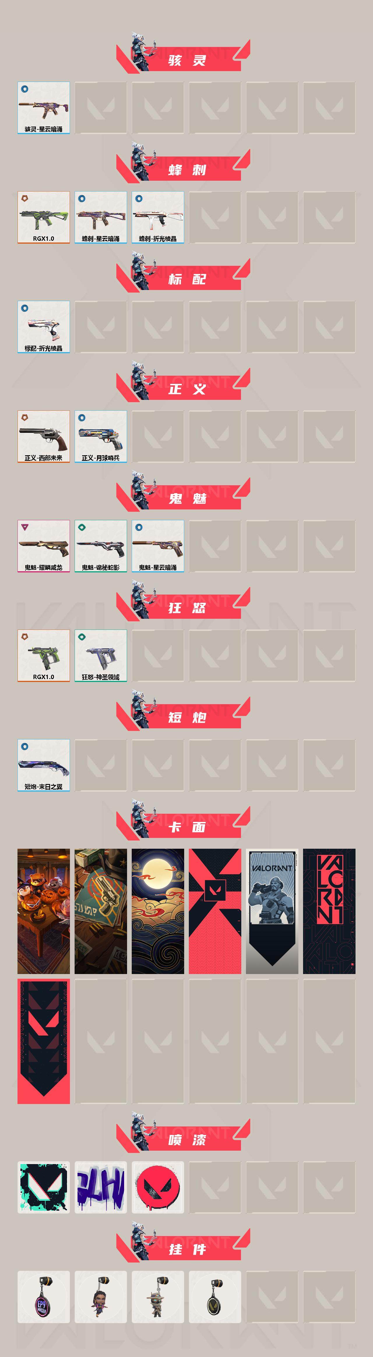 【套装】:rgx 11z pro套装 【英雄】:幻棱,炼狱,维斯,暮蝶,钛狐,壹决,铁臂,捷风,幽影,不死鸟,贤者,猎枭,零,芮娜,奇乐,尚勃勒,霓虹,斯凯,夜露,k/o,盖可,钢锁 【近战武器】:近战武器-rgx 11z pro 战刀,近战武器-剥皮小刀,近战武器-诡秘蛇影 军刀,近战武器-神圣领域 战刀,近战武器-日耀风暴 遗器 【狂徒】:狂徒-洪荒怒焰,狂徒-混沌序曲,狂徒-rgx 11z pro,狂徒-诡秘蛇影 【幻影】:幻影-归零者//2.0,幻影-侦察力量,幻影-神中神罚,幻影-神圣领域,幻影-末日之翼 【戍卫】:戍卫-噬影者,戍卫-rgx 11z pro,戍卫-月球哨兵,戍卫-折光棱晶 【獠犬】:獠犬-神圣领域 【冥驹】:冥驹-星云暗涌 【飞将】:飞将-末日之翼 【莽侠】:莽侠-诡秘蛇影,莽侠-月球哨兵 【战神】:战神-神圣领域 【奥丁】:奥丁-末日之翼 【判官】:判官-诡秘蛇影 【雄鹿】:雄鹿-月球哨兵 【骇灵】:骇灵-星云暗涌 【蜂刺】:蜂刺-rgx 11z pro,蜂刺-星云暗涌,蜂刺-折光棱晶 【标配】:标配-折光棱晶 【正义】:正义-西部未来,正义-月球哨兵 【鬼魅】:鬼魅-耀鳞威龙,鬼魅-诡秘蛇影,鬼魅-星云暗涌 【狂怒】:狂怒-rgx 11z pro,狂怒-神圣领域 【短炮】:短炮-末日之翼 【卡面】:南瓜盛典 卡面,正义的化身 卡面,纤云弄巧 卡面,代号红色 卡面,新兵报到 卡面,v契约 卡面,无畏契约 卡面 【喷漆】:胜利属于无畏契约 喷漆,glhf 喷漆,无畏契约 喷漆 【挂饰】:第九季//第三幕 纪念币 挂饰,无畏契约go!第一卷 芮娜 挂饰,无畏契约go!第一卷 零 挂饰,无畏契约 纪念币 挂饰