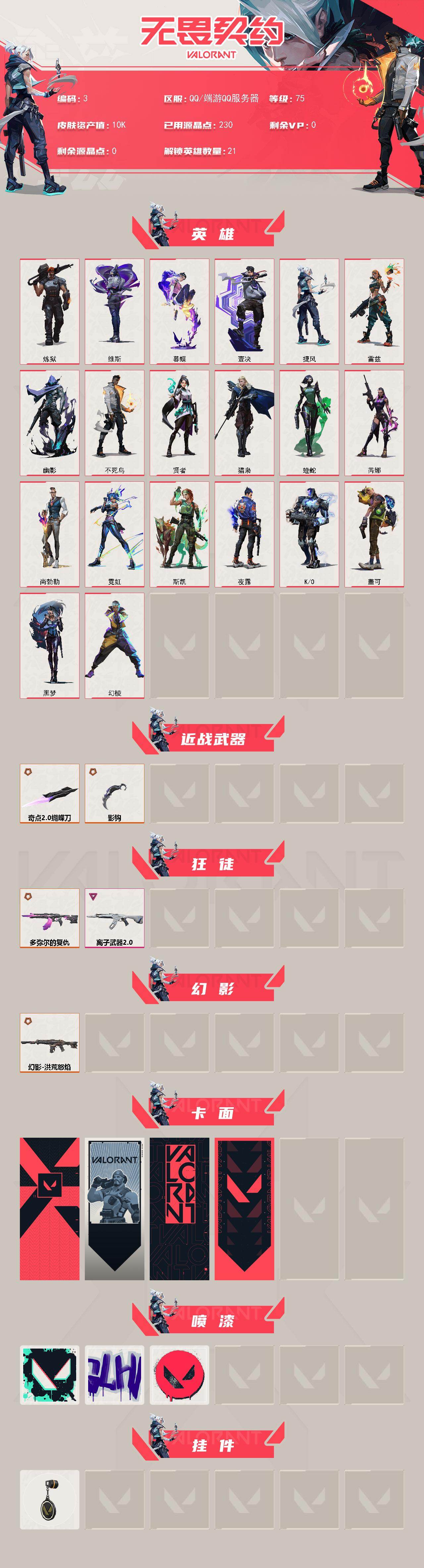 【英雄】:幻棱,炼狱,维斯,暮蝶,壹决,捷风,雷兹,幽影,不死鸟,贤者,猎枭,蝰蛇,芮娜,尚勃勒,霓虹,斯凯,夜露,k/o,盖可,黑梦 【近战武器】:近战武器-影钩,近战武器-奇点//2.0 蝴蝶刀 【狂徒】:狂徒-多弥尔的复仇,狂徒-离子武器//2.0 【幻影】:幻影-洪荒怒焰 【卡面】:代号红色 卡面,新兵报到 卡面,v契约 卡面,无畏契约 卡面 【喷漆】:胜利属于无畏契约 喷漆,glhf 喷漆,无畏契约 喷漆 【挂饰】:无畏契约 纪念币 挂饰