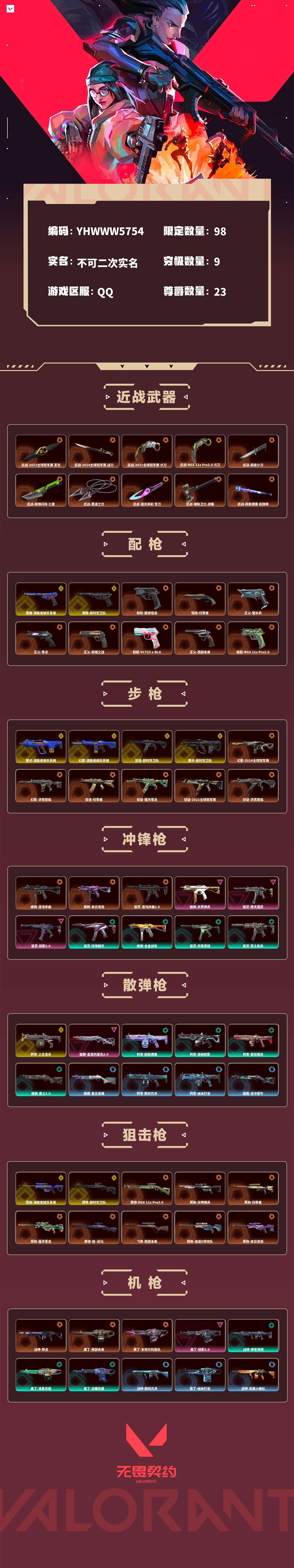 【无畏契约】【yhwww5754】等级:354,金皮:獠犬-源能者娱乐系统|冥驹-源能者娱乐系统|幻影-源能者娱乐系统|鬼魅-源能者娱乐系统|判官-上古龙炎|狂徒-超时空卫队|獠犬-超时空卫队|莽侠-超时空卫队|鬼魅-超时空卫队__橙皮:蜂刺-混沌序曲|标配-黯夜怪谈|短炮-归零者|幻影-2024全球冠军赛|近战-2023全球冠军赛 苦无|幻影-洪荒怒焰|近战-2024全球冠军赛 战刀|近战-2021全球冠军赛 爪刀|近战-rgx 11z pro3.0 爪刀|近战-剥皮小刀|近战-超限闪存 匕首|近战-黑波之刃|近战-弧光异彩 军刀|近战-钢轨卫士 战锤|近战-超能偶像 应援棒|近战-堕天遗武 仪式匕首|近战-离火刃|近战-流星兵团 短剑|近战-灵魂冲击 镰刃|近战-魄月玄刃|近战-街机高手|近战-生物收割器|近战-沙尘幻旅 匕首|近战-天玄刀|近战-珍珠棘贝 短剑|近战-紫金爪刀|莽侠-rgx 11z pro3.0|狂徒-归零者|狂徒-偃月苍龙|狂徒-2021全球冠军赛|狂徒-洪荒怒焰|獠犬-归零者|狂徒-混沌序曲|狂徒-2023全球冠军赛|正义-塑水宗|正义-奇点|正义-双城之战|冥驹-光明哨兵|冥驹-归零者|战神-奇点|冥驹-偃月苍龙|近战-合金战车 军刀|近战-影刃|近战-荒土机兵 热能刀|狂徒-双城之战|近战-双城之战 拳套|近战-穿花蝴蝶|近战-镭切|莽侠-创·纪元|近战-神圣领域 战刀|标配-vct25 x blg|飞将-西部未来|正义-西部未来|奥丁-西部未来|幻影-西部未来|近战-未来开拓者|近战-vct 2025 爪刀|标配-rgx 11z pro2.0|狂徒-虚空遗器|近战-诡秘蛇影 军刀|戍卫-电音光谱|獠犬-电音光谱|标配-电音光谱|幻影-电音光谱|近战-谐波音谱|近战-5周年公测重制版 苍龙之刃|近战-光荣异象 歧途|近战-日耀风暴 遗器|狂徒-rgx 11z pro|近战-2022全球冠军赛 蝴蝶刀|幻影-2022全球冠军赛|近战-阿特拉斯指挥部 甩棍|近战-超时空卫队 三棱军刺|近战-嘟昂嘟昂超弹力水球拳套|狂徒-滋滋x特攻队|冥驹-滋滋x特攻队|近战-魔术火花|近战-星际猎兵 短剑|幻影-末日泡泡|冥驹-末日泡泡|正义-末日泡泡|蜂刺-末日泡泡|近战-泡泡电锯|狂徒-2025全球冠军赛|近战-2025全球冠军赛 蝴蝶刀|近战-影钩|幻影-混沌序曲2.0|獠犬-混沌序曲2.0|正义-混沌序曲2.0|骇灵-混沌序曲2.0|近战-混沌链枷|狂徒-多弥尔的复仇|戍卫-多弥尔的复仇|奥丁-多弥尔的复仇|标配-多弥尔的复仇|近战-多弥尔之裁|近战-废土2.0 撬棍__紫皮:标配-堕天遗武|飞将-天界神兵|蜂刺-天界神兵|骇灵-堕天遗武|鬼魅-天界神兵|幻影-般若假面|幻影-侦察力量|狂徒-盖亚的复仇|狂徒-海洋之星|狂徒-堕天遗武|冥驹-堕天遗武|戍卫-天界神兵|狂徒-紫阙金琅|雄鹿-盖亚的复仇2.0|狂徒-掠影|狂徒-离子武器2.0|狂怒-离子武器2.0|狂徒-奇幻朋克3.0|幻影-奇幻朋克3.0|骇灵-掠影2.0|奥丁-掠影2.0|鬼魅-掠影2.0|幻影-掠影2.0__绿皮:短炮-钢轨卫士|骇灵-珍珠棘贝|幻影-珍珠棘贝|狂怒-钢轨卫士|狂徒-钢轨卫士|狂怒-珍珠棘贝|戍卫-钢轨卫士|戍卫-珍珠棘贝|蜂刺-合金战车|正义-合金战车|幻影-合金战车|飞将-合金战车|骇灵-无限竞技|狂徒-荒土机兵|标配-荒土机兵|骇灵-荒土机兵|冥驹-荒土机兵|獠犬-神圣领域|狂怒-神圣领域|战神-神圣领域|幻影-神圣领域|骇灵-魄月玄兔|飞将-魄月玄兔|鬼魅-魄月玄兔|狂徒-魄月玄兔|戍卫-超能偶像|标配-超能偶像|狂徒-超能偶像|判官-超能偶像|正义-超限闪存|莽侠-超限闪存|幻影-超限闪存|蜂刺-超限闪存|短炮-弧光异彩|獠犬-弧光异彩|蜂刺-弧光异彩|狂徒-弧光异彩|骇灵-流星兵团|鬼魅-流星兵团|狂徒-流星兵团|奥丁-流星兵团|正义-沙尘幻旅|狂徒-沙尘幻旅|飞将-沙尘幻旅|骇灵-沙尘幻旅|幻影-噬源兽防卫工程|判官-诡秘蛇影|鬼魅-诡秘蛇影|莽侠-诡秘蛇影|狂徒-诡秘蛇影|正义-日耀风暴|幻影-日耀风暴|奥丁-日耀风暴|短炮-悠闲猫生|飞将-悠闲猫生|幻影-悠闲猫生|獠犬-悠闲猫生|判官-星际猎兵|飞将-星际猎兵|标配-星际猎兵|狂徒-幻心猎手|幻影-废土2.0|莽侠-废土2.0|雄鹿-废土2.0|獠犬-废土2.0__蓝皮:鬼魅-光导纤维|飞将-光导纤维|标配-光导纤维|骇灵-光导纤维|獠犬-复古浪潮|冥驹-复古浪潮|雄鹿-复古浪潮|正义-复古浪潮|标配-超能冲撞|狂怒-花漾粉红|骇灵-花漾粉红|戍卫-花漾粉红|冥驹-花漾粉红|战神-数码咒术|獠犬-数码咒术|判官-数码咒术|鬼魅-数码咒术|正义-游戏结束|判官-纳米打击|正义-纳米打击|奥丁-纳米打击|幻影-纳米打击|雄鹿-逆冲蛮牛|狂怒-逆冲蛮牛|戍卫-逆冲蛮牛|獠犬-逆冲蛮牛|鬼魅-星云暗涌|骇灵-星云暗涌|正义-月球哨兵|莽侠-月球哨兵|戍卫-月球哨兵|雄鹿-月球哨兵|鬼魅-采蜜小蜂队|战神-采蜜小蜂队|獠犬-采蜜小蜂队|判官-采蜜小蜂队|戍卫-彩梦之城|雄鹿-彩梦之城|标配-彩梦之城|骇灵-浮光跃金|标配-浮光跃金|戍卫-浮光跃金|战神-浮光跃金|鬼魅-胡桃狂想|獠犬-胡桃狂想|蜂刺-胡桃狂想|冥驹-胡桃狂想|蜂刺-聚合之力|幻影-聚合之力|狂怒-聚合之力|飞将-聚合之力|戍卫-萌彩剪影|战神-萌彩剪影|狂怒-萌彩剪影|判官-萌彩剪影|鬼魅-模拟赫兹|獠犬-模拟赫兹|冥驹-模拟赫兹|雄鹿-模拟赫兹|战神-深海水族|短炮-深海水族|蜂刺-深海水族|莽侠-深海水族|莽侠-纤云弄巧|正义-纤云弄巧|短炮-纤云弄巧|蜂刺-纤云弄巧|鬼魅-信手涂鸦|骇灵-信手涂鸦|奥丁-信手涂鸦|飞将-信手涂鸦|冥驹-星云暗涌|蜂刺-星云暗涌|蜂刺-战术小伙伴|幻影-战术小伙伴|獠犬-战术小伙伴|奥丁-战术小伙伴|飞将-战术熊与伙伴们|狂怒-战术熊与伙伴们|戍卫-战术熊与伙伴们|