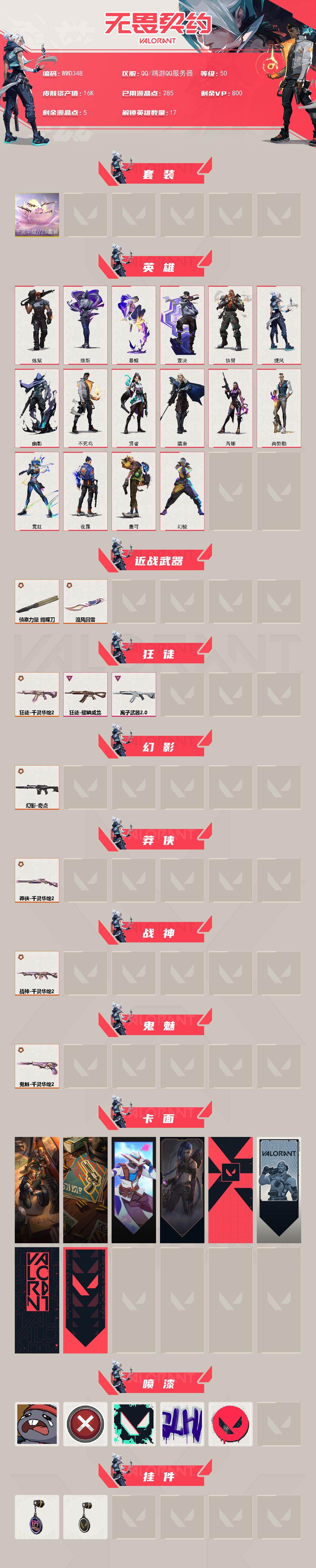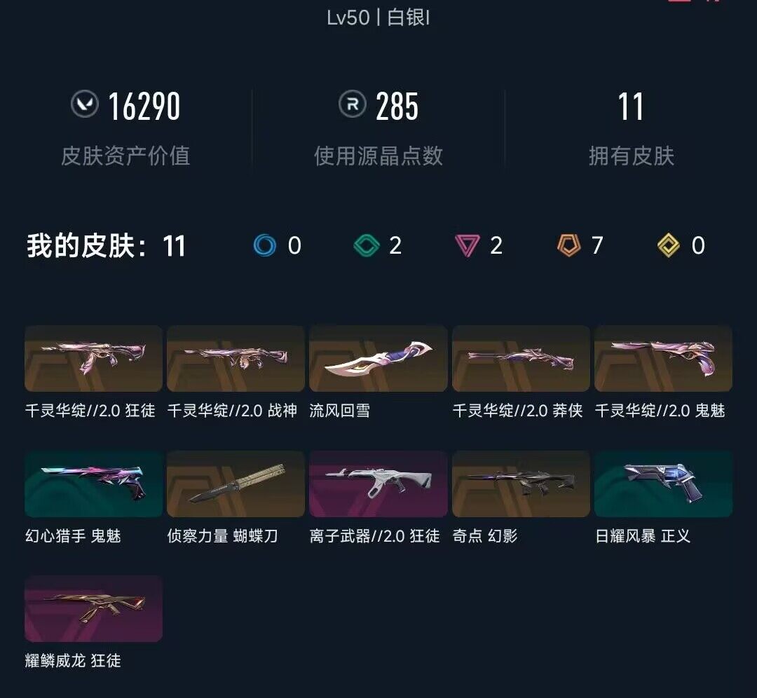 【wwd348】终极7/卓越2/皮肤11/等级50/段位:白银/千灵华绽//2.0套装/幻棱/炼狱/维斯/暮蝶/壹决/铁臂/捷风/幽影/不死鸟/贤者/猎枭/芮娜/尚勃勒/霓虹/夜露/盖可/近战武器-流风回雪/近战武器-侦察力量 蝴蝶刀/狂徒-千灵华绽//2.0/狂徒-耀鳞威龙/狂徒-离子武器//2.0/幻影-奇点/莽侠-千灵华绽//2.0/战神-千灵华绽//2.0/鬼魅-千灵华绽//2.0/修车达人 卡面/正义的化身 卡面/无畏契约go!第一卷:零 卡面/《双城之战》金克丝 卡面/代号红色 卡面/新兵报到 卡面/v契约 卡面/无畏契约 卡面/熊抱 喷漆/买装还是存钱 喷漆/胜利属于无畏契约 喷漆/glhf 喷漆/无畏契约 喷漆/第九季//第二幕 纪念币 挂饰/无畏契约 纪念币 挂饰