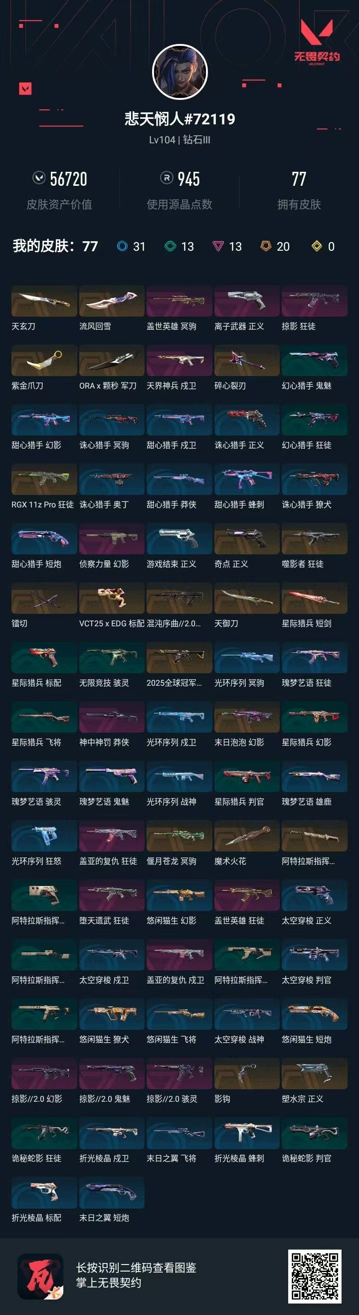 20橙皮 13紫皮 77皮肤 19英雄 75卡面 945已用源晶 钻石段位 有社交场景限制 【近战武器皮肤】镭切星际猎兵 短剑阿特拉斯指挥部碎心裂刃ax颗秒 军刀流风回雪魔术火花影钩天御刀紫金爪刀天玄刀 【佩呛皮肤】标配-vct25xedg鬼魅-掠影2.0正义-奇点正义