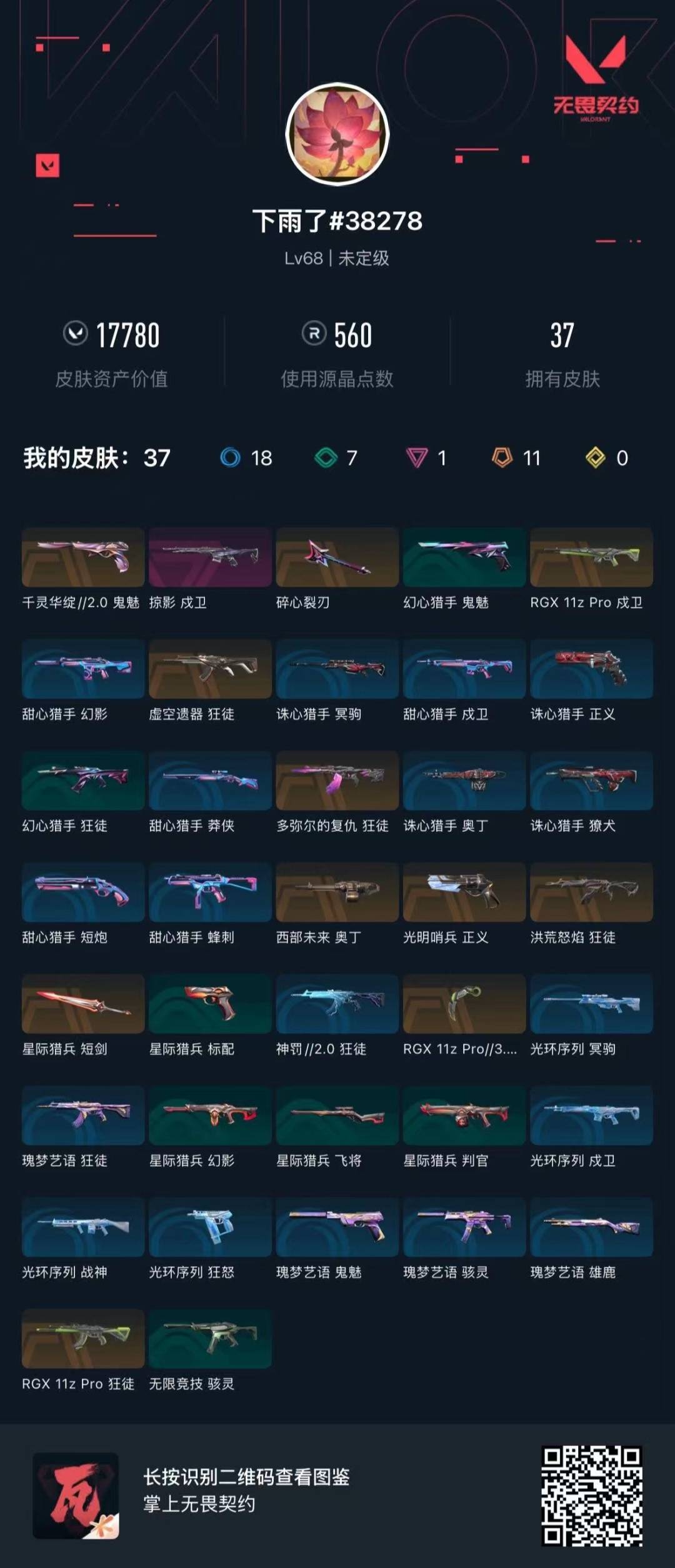 [16386792]11橙皮 1紫皮 37皮肤 12英雄 68卡面 560已用源晶 未定级段位 【近战武器皮肤】星际猎兵 短剑碎心裂刃爪刀-rgx 11z pro 3.0 【佩呛皮肤】正义-光明哨兵鬼魅-千灵华绽//2.0 【步呛皮肤】狂徒-虚空遗器狂徒-rgx 11z pro戍卫-掠影戍卫-rgx 11z pro多弥尔的复仇 狂徒狂徒-洪荒怒焰 【机呛皮肤】奥丁-西部未来 【挂饰】薰衣草之心挂饰双城之战魄罗挂饰