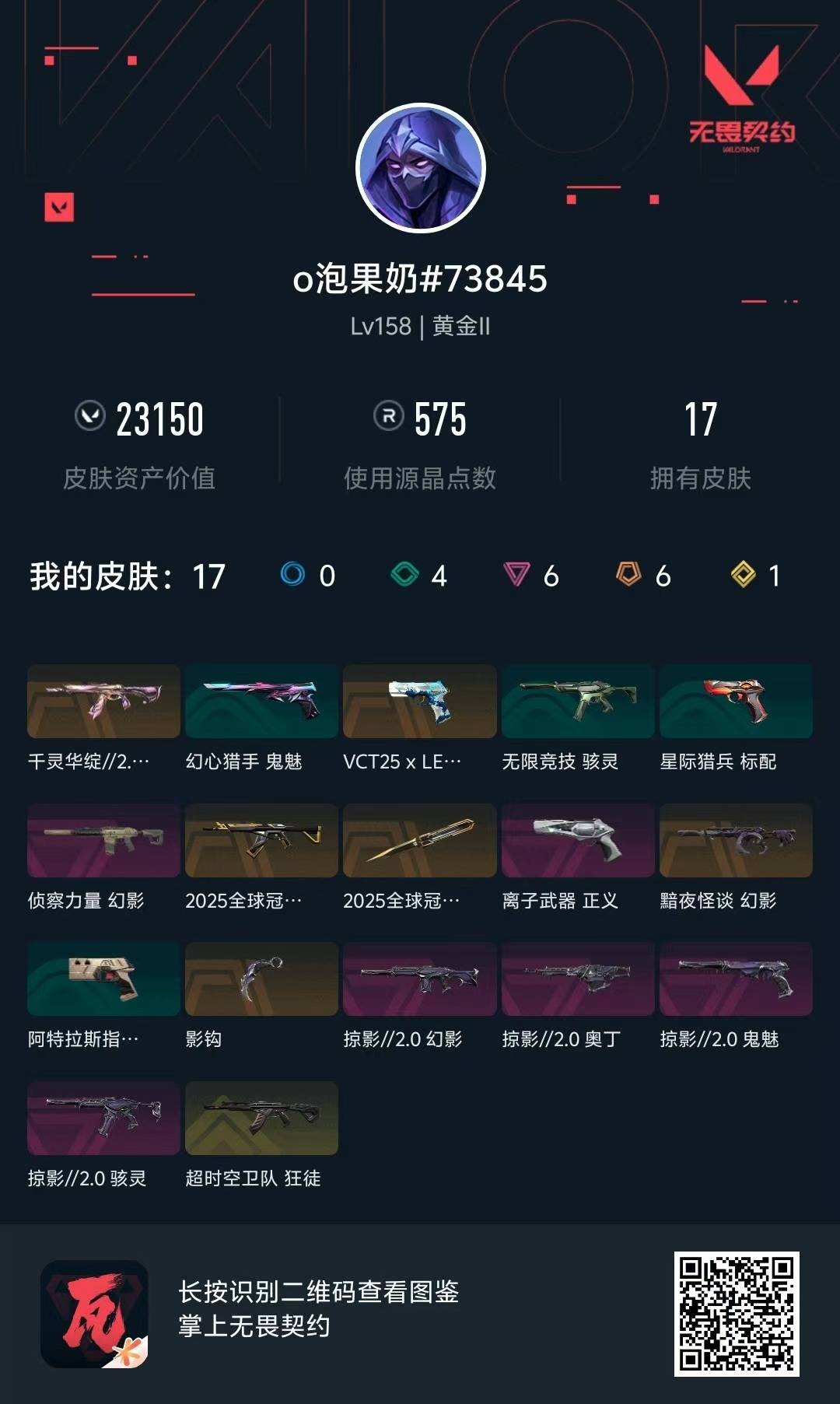 [16387436]6橙皮 1金皮 6紫皮 17皮肤 24英雄 72卡面 575已用源晶 黄金段位 【套装】2025全球冠军赛掠影2.0套装 【近战武器皮肤】2025全球冠军赛 蝴蝶刀影钩 【佩呛皮肤】正义-离子武器标配-vct25xlev鬼魅-掠影2.0 【冲锋呛皮肤】骇灵-掠影2.0 【步呛皮肤】幻影-侦察力量狂徒-超时空卫队狂徒-千灵华绽//2.02025全球冠军赛 狂徒幻影-黯夜怪谈幻影-掠影2.0 【机呛皮肤】奥丁-掠影2.0 【挂饰】v26第一幕纪念币 挂饰神中神挂饰v25第三幕:黑铁 挂饰袖珍捷风挂饰传世莲华挂饰2025全球冠军赛挂饰vctxlev挂饰