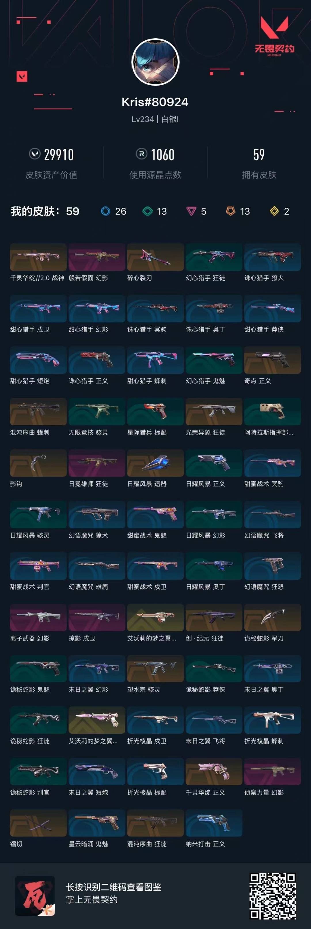 13橙皮 2金皮 5紫皮 59皮肤 28英雄 114卡面 1060已用源晶 白银段位 【近战武器皮肤】日耀风暴 遗器影钩诡秘蛇影镭切碎心裂刃 【佩呛皮肤】正义-奇点正义-千灵华绽鬼魅-艾沃莉的梦之翼 【冲锋呛皮肤】蜂刺-混沌序曲骇灵-塑水宗 【步呛皮肤】狂徒-创·纪元戍卫-掠影狂