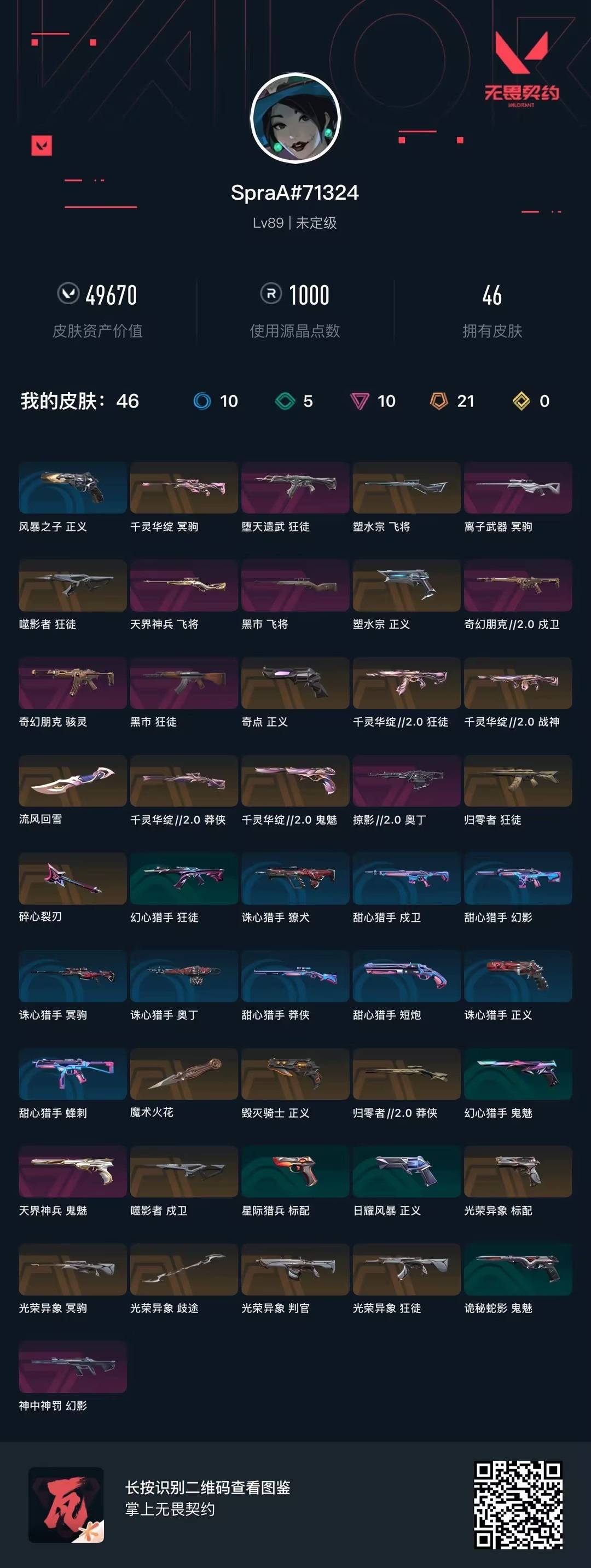 [16388054]21橙皮 10紫皮 46皮肤 18英雄 60卡面 1000已用源晶 未定级段位 【套装】千灵华绽//2.0 套装光荣异象 【近战武器皮肤】碎心裂刃流风回雪魔术火花歧途 【佩呛皮肤】正义-毁灭骑士标配-光荣异象鬼魅-千灵华绽//2.0正义-奇点正义-塑水宗鬼魅-天界神兵 【冲锋呛皮肤】骇灵-奇幻朋克 【霰弹呛皮肤】判官-光荣异象 【步呛皮肤】狂徒-噬影者戍卫-噬影者幻影-神中神罚戍卫-奇幻朋克2.0狂徒-黑市狂徒-千灵华绽//2.0狂徒-光荣异象狂徒-归零者狂徒-堕天遗武 【狙击呛皮肤】飞将-黑市莽侠-归零者//2.0冥驹-光荣异象莽侠-千灵华绽//2.0飞将-天界神兵飞将-塑水宗冥驹-千灵华绽冥驹-离子武器 【机呛皮肤】战神-千灵华绽//2.0奥丁-掠影2.0 【挂饰】薰衣草之心挂饰千灵华绽//2.0 挂饰双城之战小蛋糕挂饰光荣异象挂饰
