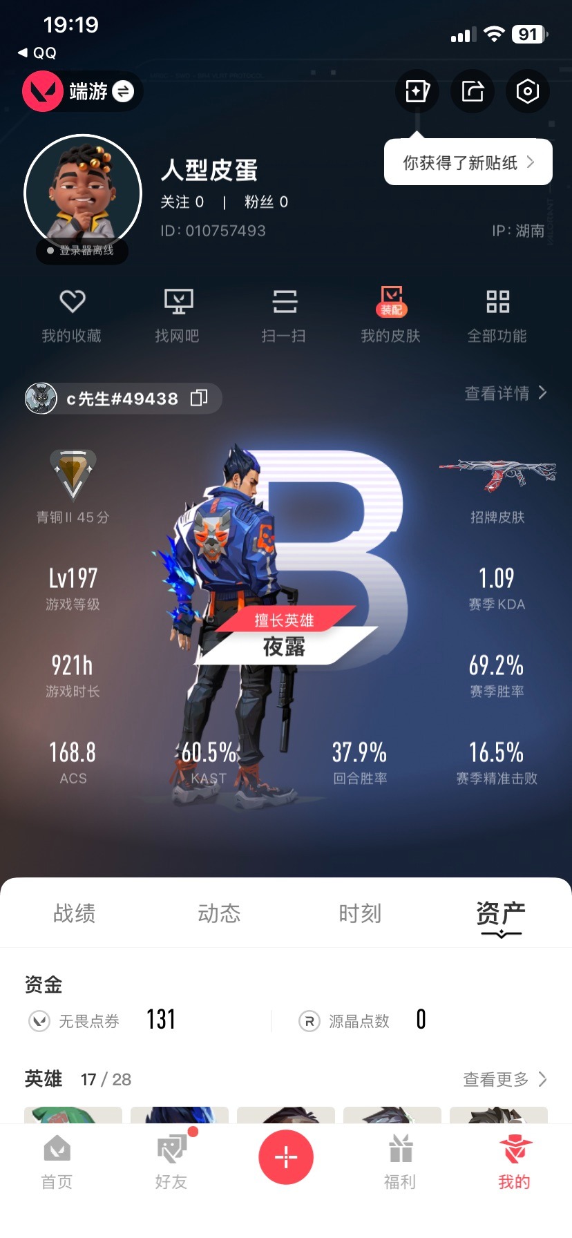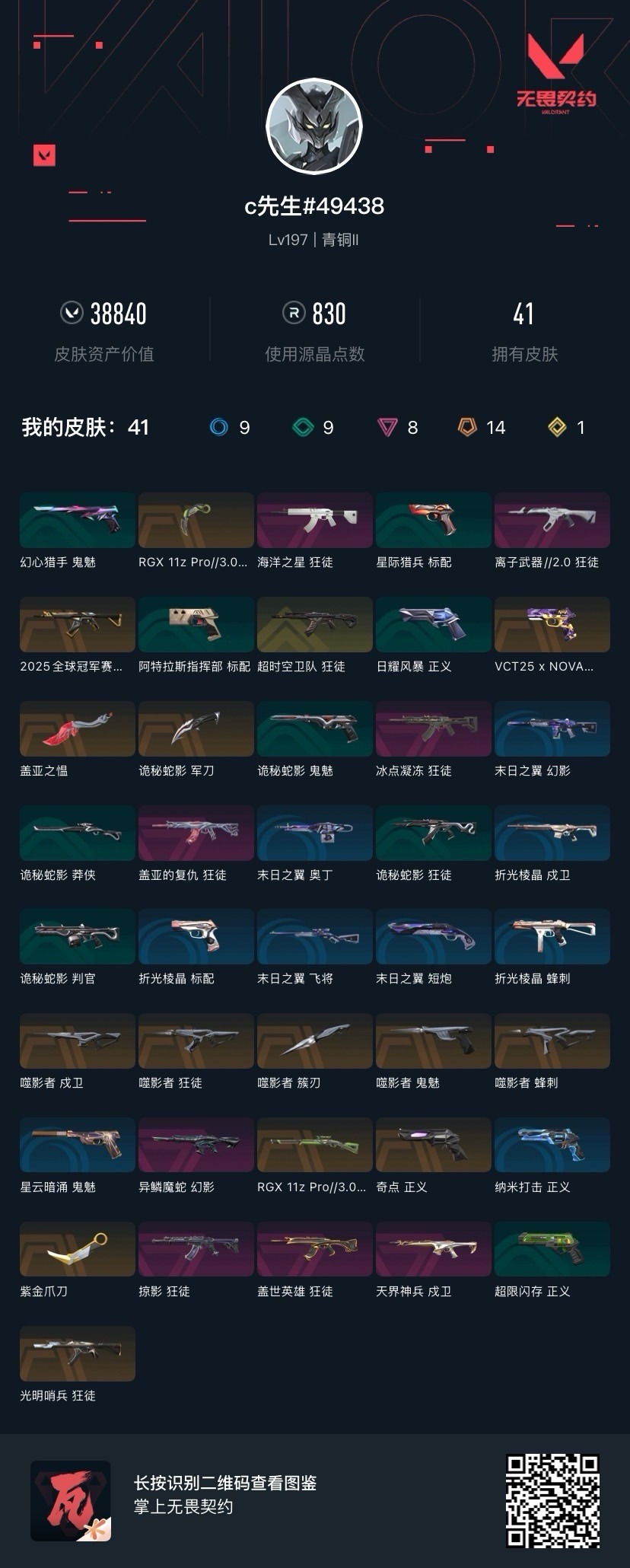 [16388373]14橙皮 1金皮 8紫皮 41皮肤 17英雄 109卡面 830已用源晶 青铜段位 【套装】噬影者 【近战武器皮肤】诡秘蛇影噬影者簇刃紫金爪刀爪刀-rgx 11z pro 3.0盖亚之愠 【佩呛皮肤】标配-vct25xnova鬼魅-噬影者正义-奇点 【冲锋呛皮肤】蜂刺-噬影者 【步呛皮肤】狂徒-噬影者戍卫-噬影者狂徒-离子武器2.0狂徒-光明哨兵幻影-异鳞魔蛇狂徒-掠影2025全球冠军赛 狂徒狂徒-超时空卫队狂徒-海洋之星狂徒-盖亚的复仇狂徒-盖世英雄狂徒-冰点凝冻戍卫-天界神兵 【狙击呛皮肤】莽侠-rgx 11z pro 3.0 【挂饰】薰衣草之心挂饰神中神挂饰双城之战小蛋糕挂饰vctxnova挂饰终章ko小金人挂饰
