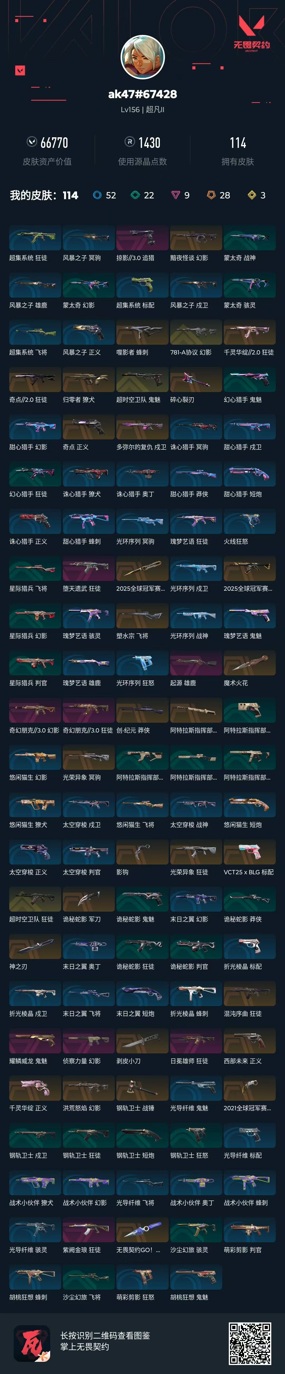 [16388539]q193414 (2021全球冠军赛-爪刀/2025全球冠军赛套装/奇幻朋克3.0套装)无畏契约/等级156/段位超凡/英雄28/皮肤114/资产66770/已使用r点1430/剩余r点10/2025全球冠军赛-狂徒2025全球冠军赛-蝴蝶刀,奇幻朋克//3.0-狂徒奇幻朋克//3.0-幻影魔术火花,碎心裂刃,阿特拉斯指挥部-甩棍,诡秘蛇影-军刀,钢轨卫士-战锤,影钩,神之刃,2021全球冠军赛-爪刀,剥皮小刀,无畏契约go第一卷-苦无,多弥尔的复仇-戍卫,光荣异象-狂徒,千灵华绽//2.0-狂徒,混沌序曲-狂徒,黯夜怪谈-幻影,洪荒怒焰-幻影,奇点//2.0-狂徒,归零者-獠犬,超时空卫队-狂徒,781-a协议-幻影,堕天遗武-狂徒,紫阙金琅-狂徒,侦察力量-幻影,日冕雄师-狂徒,光荣异象-冥驹,创·纪元-莽侠,塑水宗-飞将,噬影者-蜂刺,起源-雄鹿,vct25-x-blg-标配,西部未来-正义,千灵华绽-正义,奇点-正义,超时空卫队-鬼魅,掠影//3.0-追猎,耀鳞威龙-鬼魅