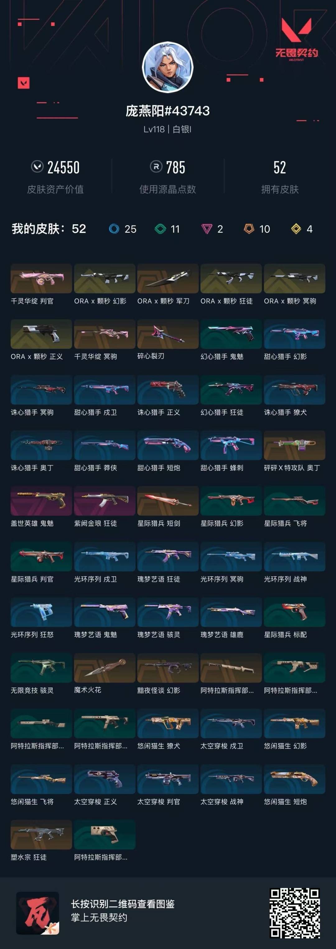10橙皮 4金皮 2紫皮 52皮肤 26英雄 93卡面 810已用源晶 白银段位 【套装】ax颗秒 【近战武器皮肤】阿特拉斯指挥部魔术火花碎心裂刃星际猎兵 短剑ax颗秒 军刀 【佩呛皮肤】正义-ax颗秒鬼魅-盖世英雄 【霰弹呛皮肤】判官-千灵华绽 【步呛皮肤】狂徒-ax颗