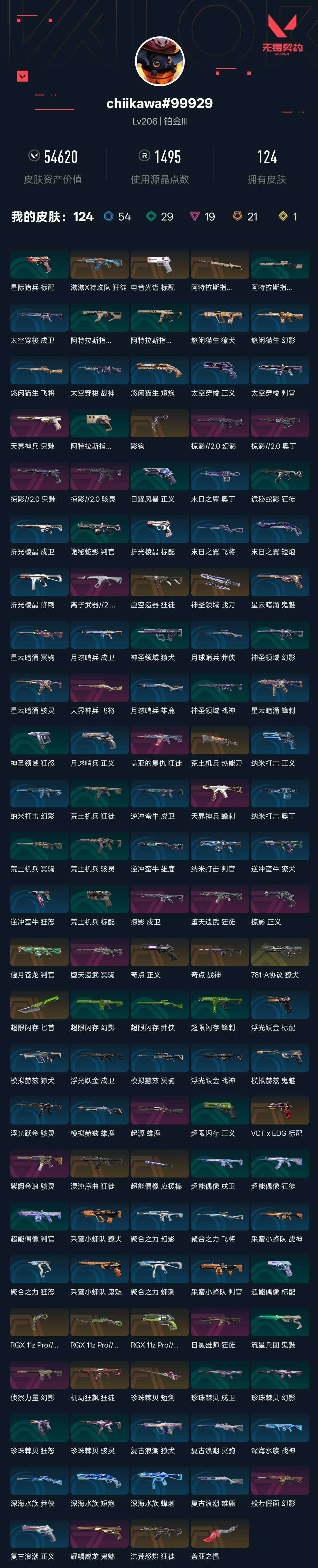 【无畏契约】【yhwww9016】等级:208,已用无畏点54620,已用源晶点1495,金皮:獠犬-781-a协议__橙皮:标配-vct x edg|近战-rgx 11z pro3.0 爪刀|近战-超限闪存 匕首|近战-超能偶像 应援棒|近战-盖亚之愠|近战-珍珠棘贝 短剑|狂徒-机动狂飙|莽侠-rgx 11z pro3.0|狂徒-洪荒怒焰|狂徒-混沌序曲|正义-奇点|正义-rgx 11z pro3.0|战神-奇点|判官-偃月苍龙|近战-荒土机兵 热能刀|近战-神圣领域 战刀|狂徒-虚空遗器|标配-电音光谱|近战-阿特拉斯指挥部 甩棍|狂徒-滋滋x特攻队|近战-影钩__紫皮:飞将-天界神兵|蜂刺-天界神兵|鬼魅-耀鳞威龙|鬼魅-天界神兵|骇灵-紫阙金琅|幻影-般若假面|狂徒-日冕雄师|幻影-侦察力量|狂徒-盖亚的复仇|狂徒-堕天遗武|冥驹-堕天遗武|雄鹿-起源|戍卫-掠影|正义-掠影|狂徒-离子武器2.0|骇灵-掠影2.0|奥丁-掠影2.0|鬼魅-掠影2.0|幻影-掠影2.0__绿皮:骇灵-珍珠棘贝|幻影-珍珠棘贝|狂怒-珍珠棘贝|戍卫-珍珠棘贝|狂徒-荒土机兵|标配-荒土机兵|骇灵-荒土机兵|冥驹-荒土机兵|獠犬-神圣领域|狂怒-神圣领域|战神-神圣领域|幻影-神圣领域|戍卫-超能偶像|标配-超能偶像|狂徒-超能偶像|判官-超能偶像|正义-超限闪存|莽侠-超限闪存|幻影-超限闪存|蜂刺-超限闪存|鬼魅-流星兵团|判官-诡秘蛇影|狂徒-诡秘蛇影|正义-日耀风暴|短炮-悠闲猫生|飞将-悠闲猫生|幻影-悠闲猫生|獠犬-悠闲猫生|标配-星际猎兵__蓝皮:獠犬-复古浪潮|冥驹-复古浪潮|雄鹿-复古浪潮|正义-复古浪潮|判官-纳米打击|正义-纳米打击|奥丁-纳米打击|幻影-纳米打击|雄鹿-逆冲蛮牛|狂怒-逆冲蛮牛|戍卫-逆冲蛮牛|獠犬-逆冲蛮牛|鬼魅-星云暗涌|骇灵-星云暗涌|正义-月球哨兵|莽侠-月球哨兵|戍卫-月球哨兵|雄鹿-月球哨兵|鬼魅-采蜜小蜂队|战神-采蜜小蜂队|獠犬-采蜜小蜂队|判官-采蜜小蜂队|骇灵-浮光跃金|标配-浮光跃金|戍卫-浮光跃金|战神-浮光跃金|蜂刺-聚合之力|幻影-聚合之力|狂怒-聚合之力|飞将-聚合之力|鬼魅-模拟赫兹|獠犬-模拟赫兹|冥驹-模拟赫兹|雄鹿-模拟赫兹|战神-深海水族|短炮-深海水族|蜂刺-深海水族|莽侠-深海水族|冥驹-星云暗涌|蜂刺-星云暗涌|蜂刺-折光棱晶|戍卫-折光棱晶|标配-折光棱晶|飞将-末日之翼|短炮-末日之翼|奥丁-末日之翼|正义-太空穿梭|战神-太空穿梭|判官-太空穿梭|戍卫-太空穿梭|骇灵-阿特拉斯指挥部|莽侠-阿特拉斯指挥部|标配-阿特拉斯指挥部|狂徒-阿特拉斯指挥部__段位:铂金__英雄:尚勃勒|维斯|黑梦|斯凯|暮蝶|盖可|霓虹|壹决|星礈|k/o|幽影|夜露|钢锁|海神|奇乐|炼狱|铁臂|贤者|猎枭|钛狐|芮娜|零|捷风|蝰蛇|不死鸟|幻棱|雷兹|禁灭
