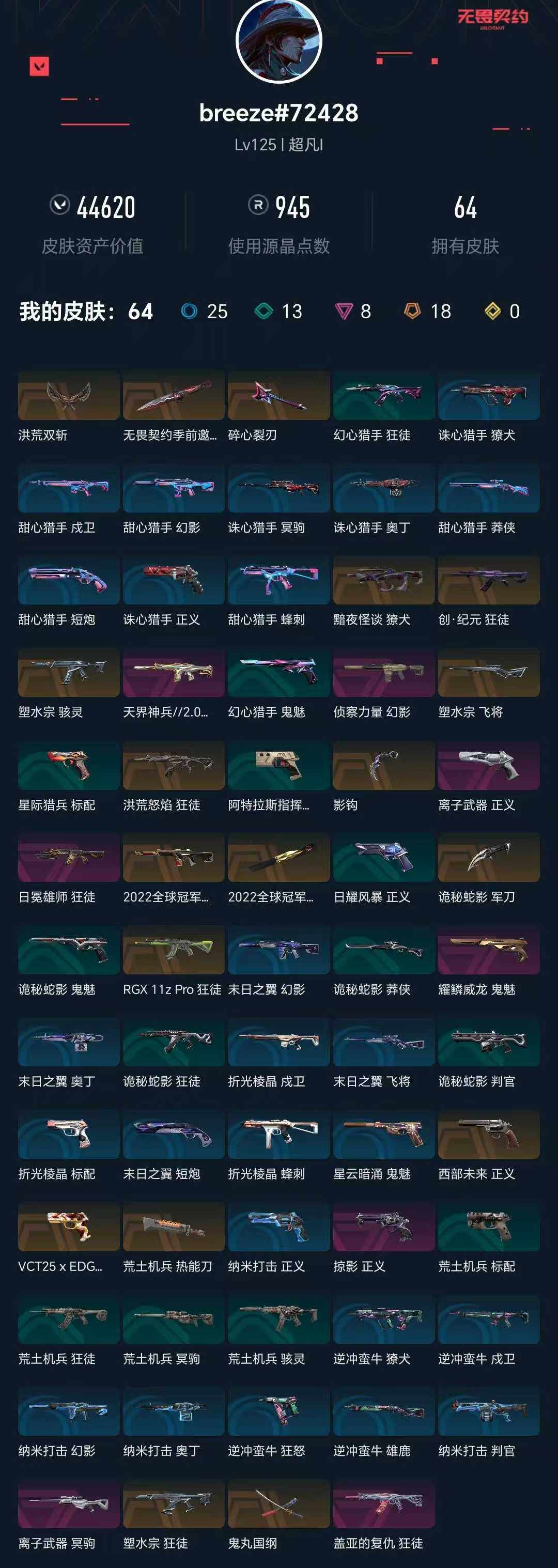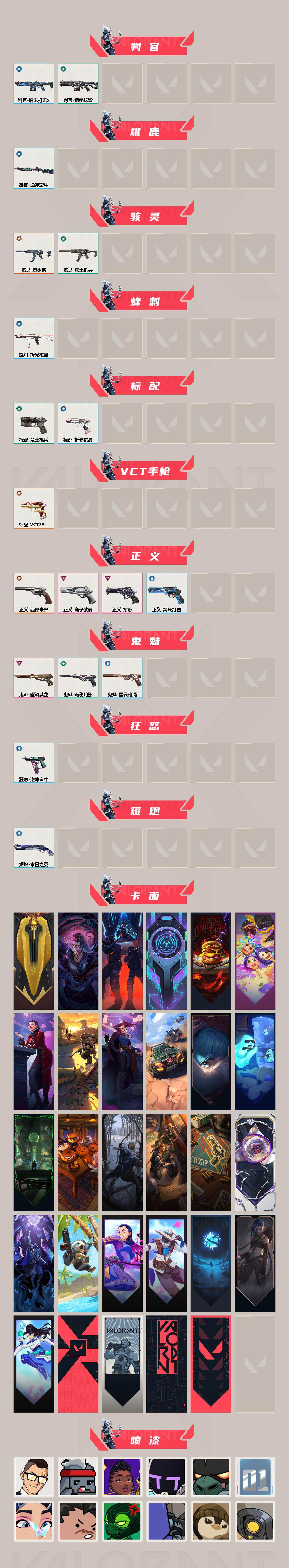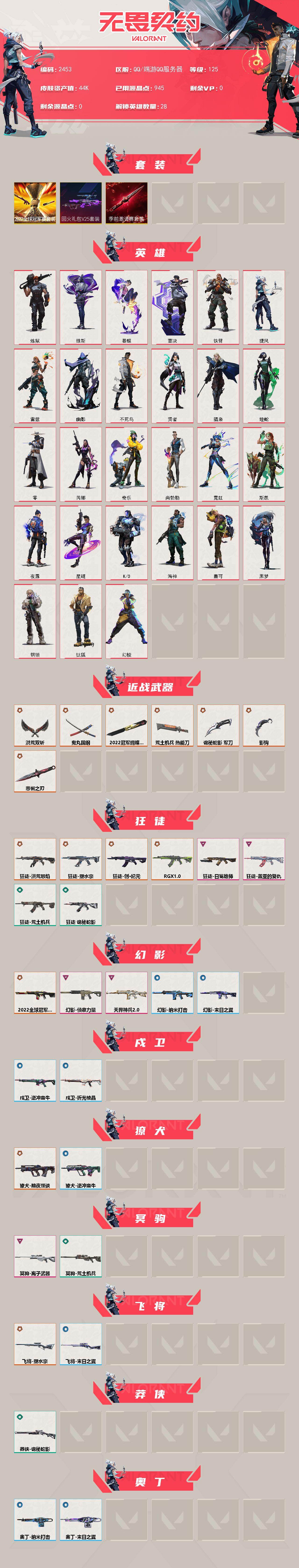 [16409247]【套装】:2022全球冠军赛套装,无畏契约季前邀请赛套装,回火礼包// v25套装 【英雄】:幻棱,炼狱,维斯,暮蝶,钛狐,壹决,铁臂,捷风,雷兹,幽影,不死鸟,贤者,猎枭,蝰蛇,零,芮娜,奇乐,尚勃勒,霓虹,斯凯,夜露,星礈,k/o,海神,盖可,黑梦,钢锁 【近战武器】:近战武器-2022全球冠军赛 蝴蝶刀,近战武器-无畏契约季前邀请赛 悲悯之刃,近战武器-影钩,近战武器-鬼丸国纲,近战武器-洪荒双斩,近战武器-荒土机兵 热能刀,近战武器-诡秘蛇影 军刀 【狂徒】:狂徒-洪荒怒焰,狂徒-塑水宗,狂徒-创·纪元,狂徒-rgx 11z pro,狂徒-盖亚的复仇,狂徒-日冕雄师,狂徒-荒土机兵,狂徒-诡秘蛇影 【幻影】:幻影-2022全球冠军赛,幻影-天界神兵//2.0,幻影-侦察力量,幻影-纳米打击,幻影-末日之翼 【戍卫】:戍卫-逆冲蛮牛,戍卫-折光棱晶 【獠犬】:獠犬-黯夜怪谈,獠犬-逆冲蛮牛 【冥驹】:冥驹-离子武器,冥驹-荒土机兵 【飞将】:飞将-塑水宗,飞将-末日之翼 【莽侠】:莽侠-诡秘蛇影 【奥丁】:奥丁-纳米打击,奥丁-末日之翼 【判官】:判官-诡秘蛇影,判官-纳米打击x 【雄鹿】:雄鹿-逆冲蛮牛 【骇灵】:骇灵-塑水宗,骇灵-荒土机兵 【蜂刺】:蜂刺-折光棱晶 【标配】:标配-荒土机兵,标配-折光棱晶 【vct手呛】:标配-vct25 x edg 【正义】:正义-西部未来,正义-掠影,正义-离子武器,正义-纳米打击 【鬼魅】:鬼魅-耀鳞威龙,鬼魅-诡秘蛇影,鬼魅-星云暗涌 【狂怒】:狂怒-逆冲蛮牛 【短炮】:短炮-末日之翼 【卡面】:进入射程 卡面,分崩离析 卡面,纳米打击 卡面,抑制技术 卡面,激斗汉堡 卡面,瓦娃脸雪糕 p2 卡面,从黄昏到黎明 卡面,荒土机兵 卡面,银弹猎手 卡面,逆冲蛮牛 卡面,《双城之战》拥抱 卡面,精灵大战 卡面,欢迎来到底城 卡面,南瓜盛典 卡面,钢弓与箭弦 卡面,修车达人 卡面,正义的化身 卡面,铁之华 卡面,失而复得 卡面,树懒大作战 卡面,无畏契约go!第一卷:芮娜 卡面,无畏契约go!第一卷:零 卡面,无垠星环 卡面,《双城之战》金克丝 卡面,无畏契约go!第一卷:贤者 卡面,代号红色 卡面,新兵报到 卡面,v契约 卡面,无畏契约 卡面 【喷漆】:小小心意 喷漆,战“素”兔 喷漆,宇宙的指引 喷漆,请求重启 喷