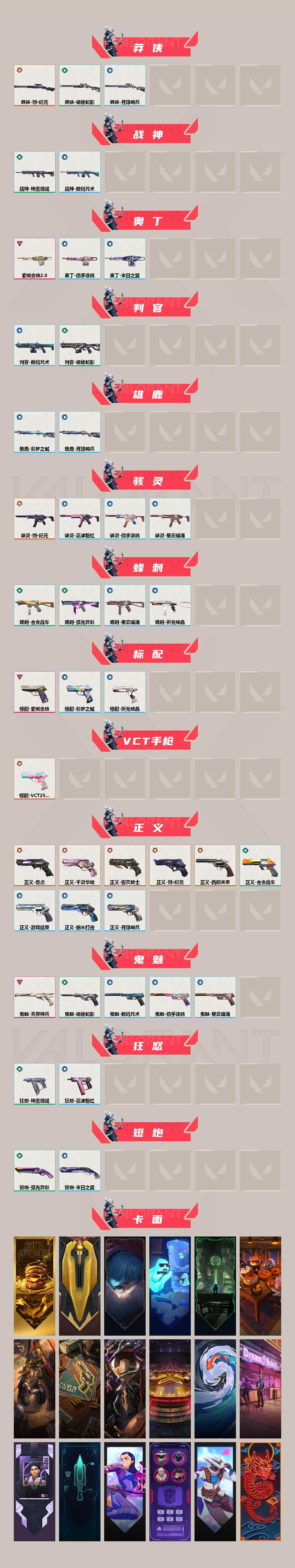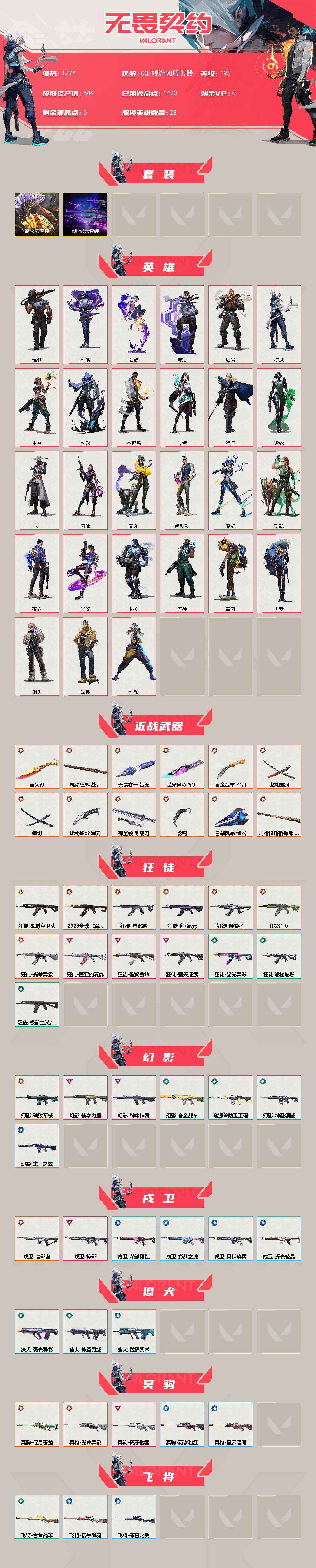 [16410344]【套装】:创·纪元套装,离火刃套装,离火刃套装 【英雄】:幻棱,炼狱,维斯,暮蝶,钛狐,壹决,铁臂,捷风,雷兹,幽影,不死鸟,贤者,猎枭,蝰蛇,零,芮娜,奇乐,尚勃勒,霓虹,斯凯,夜露,星礈,k/o,海神,盖可,黑梦,钢锁 【近战武器】:近战武器-影钩,近战武器-无畏契约go!第一卷 苦无,近战武器-离火刃,近战武器-镭切,近战武器-鬼丸国纲,近战武器-合金战车 军刀,近战武器-弧光异彩 军刀,近战武器-机动狂飙 战刀,近战武器-诡秘蛇影 军刀,近战武器-神圣领域 战刀,近战武器-日耀风暴 遗器,近战武器-阿特拉斯指挥部 甩棍 【狂徒】:狂徒-超时空卫队,狂徒-2023全球冠军赛,狂徒-塑水宗,狂徒-创·纪元,狂徒-噬影者,狂徒-rgx 11z pro,狂徒-光荣异象,狂徒-堕天遗武,狂徒-盖亚的复仇,狂徒-紫阙金琅,狂徒-弧光异彩,狂徒-诡秘蛇影,狂徒-极简主义//2.0 【幻影】:幻影-破败军械,幻影-侦察力量,幻影-神中神罚,幻影-合金战车,幻影-噬源兽防卫工程,幻影-神圣领域,幻影-末日之翼 【戍卫】:戍卫-噬影者,戍卫-掠影,戍卫-彩梦之城,戍卫-花漾粉红,戍卫-月球哨兵,戍卫-折光棱晶 【獠犬】:獠犬-弧光异彩,獠犬-神圣领域,獠犬-数码咒术 【冥驹】:冥驹-偃月苍龙,冥驹-光荣异象,冥驹-离子武器,冥驹-花漾粉红,冥驹-星云暗涌 【飞将】:飞将-合金战车,飞将-信手涂鸦,飞将-末日之翼 【莽侠】:莽侠-创·纪元,莽侠-诡秘蛇影,莽侠-月球哨兵 【战神】:战神-神圣领域,战神-数码咒术 【奥丁】:奥丁-紫阙金琅//2.0,奥丁-信手涂鸦,奥丁-末日之翼 【判官】:判官-诡秘蛇影,判官-数码咒术 【雄鹿】:雄鹿-彩梦之城,雄鹿-月球哨兵 【骇灵】:骇灵-创·纪元,骇灵-花漾粉红,骇灵-信手涂鸦,骇灵-星云暗涌 【蜂刺】:蜂刺-合金战车,蜂刺-弧光异彩,蜂刺-星云暗涌,蜂刺-折光棱晶 【标配】:标配-紫阙金琅,标配-彩梦之城,标配-折光棱晶 【vct手呛】:标配-vct25 x blg 【正义】:正义-毁灭骑士,正义-奇点,正义-千灵华绽,正义-创·纪元,正义-西部未来,正义-合金战车,正义-纳米打击,正义-游戏结束,正义-月球哨兵 【鬼魅】:鬼魅-天界神兵,鬼魅-诡秘蛇影,鬼魅-数码咒术,鬼魅-信手涂鸦,鬼魅-星云暗涌 【狂怒】:狂怒-神圣领域,狂怒-花