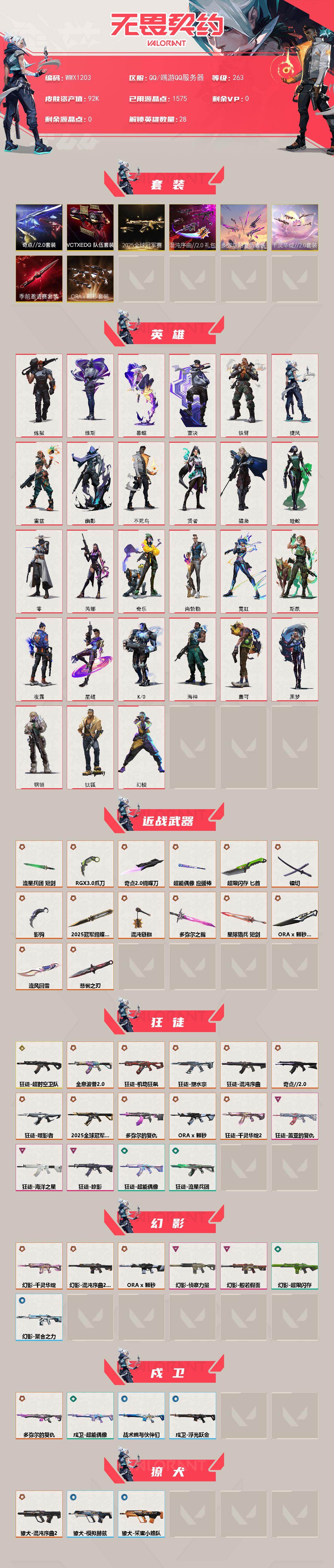 【wwx1203】终极41/传奇5/卓越7/皮肤130/等级263/段位:白银/2025全球冠军赛套装/无畏契约季前邀请赛套装/千灵华绽//2.0套装/a x 颗秒套装/多弥尔的复仇套装/混沌序曲//2.0套装/奇点//2.0套装/vctxedg 队伍套装/幻棱/炼狱/维斯/暮蝶/钛狐/壹决/铁臂/捷风/雷兹/幽影/不死鸟/贤者/猎枭/蝰蛇/零/芮娜/奇乐/尚勃勒/霓虹/斯凯/夜露/星礈/k/o/海神/盖可/黑梦/钢锁/近战武器-2025全球冠军赛 蝴蝶刀/近战武器-无畏契约季前邀请赛 悲悯之刃/近战武器-流风回雪/近战武器-a x 颗秒 军刀/近战武器-多弥尔之裁/近战武器-混沌链枷/近战武器-影钩/近战武器-奇点//2.0 蝴蝶刀/近战武器-rgx 11z pro//3.0 爪刀/近战武器-镭切/近战武器-流星兵团 短剑/近战武器-超能偶像 应援棒/近战武器-超限闪存 匕首/近战武器-星际猎兵 短剑/狂徒-超时空卫队/狂徒-2025全球冠军赛/狂徒-混沌序曲/狂徒-机动狂飙/狂徒-奇点//2.0/狂徒-全息波普//2.0/狂徒-塑水宗/狂徒-噬影者/狂徒-多弥尔的复仇/狂徒-a x 颗秒/狂徒-千灵华绽//2.0/狂徒-掠影/狂徒-盖亚的复仇/狂徒-海洋之星/狂徒-超能偶像/狂徒-流星兵团/幻影-千灵华绽/幻影-混沌序曲//2.0/幻影-a x 颗秒/幻影-般若假面/幻影-侦察力量/幻影-超限闪存/幻影-聚合之力/戍卫-多弥尔的复仇/戍卫-超能偶像/戍卫-浮光跃金/戍卫-战术熊与伙伴们/獠犬-混沌序曲//2.0/獠犬-采蜜小蜂队/獠犬-模拟赫兹/冥驹-a x 颗秒/冥驹-堕天遗武/冥驹-模拟赫兹/飞将-聚合之力/飞将-战术熊与伙伴们/莽侠-千灵华绽//2.0/莽侠-超限闪存/莽侠-纤云弄巧/战神-千灵华绽//2.0/战神-采蜜小蜂队/战神-浮光跃金/奥丁-多弥尔的复仇/奥丁-流星兵团/判官-千灵华绽/判官-超能偶像/判官-采蜜小蜂队/雄鹿-模拟赫兹/骇灵-混沌序曲//2.0/骇灵-流星兵团/骇灵-无限竞技/骇灵-浮光跃金/蜂刺-超限闪存/蜂刺-聚合之力/蜂刺-纤云弄巧/标配-多弥尔的复仇/标配-超能偶像/标配-浮光跃金/标配-战术熊与伙伴们/标配-vct x edg/正义-奇点/正义-千灵华绽/正义-混沌序曲//2.0/正义-a x 颗秒/正义-超限闪存/正义-纳米打击/正义-天涯浪客/正义-纤云弄巧/鬼魅-奇点//2.0/鬼魅-千灵华绽//2.0/鬼魅-流星兵团/鬼魅-诡秘蛇影/鬼魅-采蜜小蜂队/鬼魅-灵魂消声者/鬼魅-模拟赫兹/鬼魅-宿怨/鬼魅-星云暗涌/狂怒-聚合之力/狂怒-战术熊与伙伴们/短炮-般若假面/短炮-纤云弄巧/终章:激斗汉堡 卡面/进入射程 卡面/《双城之战》拥抱 卡面/精灵大战 卡面/欢迎来到底城 卡面/南瓜盛典 卡面/唱片的故事 卡面/钢弓与箭弦 卡面/排除故障 卡面/奇点//2.0 卡面/战术桌游 卡面/悠享食光 卡面/修车达人 卡面/模拟赫兹 卡面/浮光跃金 卡面/超限闪存 卡面/维斯工牌 卡面/正义的化身 卡面/终章:生意人麦宝 卡面/铁之华 卡面/失而复得 卡面/时间到 卡面/最高舞台 卡面/复活专家 卡面/归乡 // 蝰蛇 卡面/超能偶像 卡面/生意人麦宝 卡面/音熊登场 卡面/声感陷阱设计图 卡面/clutch 卡面/钢锁工牌 卡面/战术小伙伴的夏日 卡面/采蜜小蜂队 卡面/聚合之力 卡面/梦幻奶茶 卡面/终章:打造专属狂徒 卡面/趁热吃 卡面/西装暴徒 卡面/失控边缘 卡面/哨卫者之领域 卡面/暮蝶工牌 卡面/战术熊与伙伴们 卡面/源能反应 卡面/流星兵团 卡面/纤云弄巧 卡面/暂别喧嚣 卡面/打造专属狂徒 卡面/零点嗅探设计图 卡面/无畏契约go!第一卷:芮娜 卡面/无畏契约go!第一卷:零 卡面/代号红色 卡面/新兵报到 卡面/v契约 卡面/无畏契约 卡面/嗨宝南瓜灯 喷漆/嘭! 喷漆/都算到了 喷漆/控场勿近 喷漆/皮蛋呼呼 喷漆/像素星礈 喷漆/图谋不轨的零 喷漆/小丑猫 喷漆/模拟赫兹 喷漆/高丽风情小熊 喷漆/奇点//2.0 喷漆/蹲到一个 喷漆/全力集中 喷漆/超限闪存 喷漆/rua一下 喷漆/熊抱 喷漆/高丽风情小虎 喷漆/记在小本本 喷漆/防弹企鹅 喷漆/高丽风情小蛙 喷漆/又被闪了 喷漆/终极羞辱 喷漆/超级粉丝 喷漆/黯兽卖萌 喷漆/捷风差距 喷漆/惊声尖叫 喷漆/五人成星 喷漆/超能偶像 喷漆/放我出去 喷漆/战术熊的巴拉莱卡琴 喷漆/掩护我 喷漆/大佬发呛 喷漆/边缘试探 喷漆/拼一呛 喷漆/聚合之力 喷漆/采蜜小蜂队 喷漆/梦幻小队 喷漆/五个全都齐了 喷漆/加油!加油! 喷漆/开心到爆炸 喷漆/皮蛋萌舞 喷漆/我觉得不行 喷漆/头号粉丝 喷漆/吸一口快乐 喷漆/永远的答案 喷漆/再来一次? 喷漆/别挡我的路! 喷漆/我的刀呢? 喷漆/当然可以 喷漆/流星兵团 喷漆/战术熊与伙伴们 喷漆/禁止喷漆 喷漆/纤云弄巧 喷漆/买装还是存钱 喷漆/红鳞 喷漆/暴走萝莉 喷漆/松叶 喷漆/放下武器 喷漆/胜利属于无畏契约 喷漆/glhf 喷漆/无畏契约 喷漆/终章:猫猫木乃伊 挂饰/悠闲鸡块 挂饰/伞绳 挂饰/《双城之战》小蛋糕 挂饰/第九季//第三幕 纪念币 挂饰/拳击战术熊 挂饰/工具腰带 挂饰/无畏契约go!第一卷 芮娜 挂饰/无畏契约go!第一卷 零 挂饰/暗藏猫腻 挂饰/高丽风情 挂饰/奇点//2.0 挂饰/熔岩灯 挂饰/超限闪存 挂饰/迷你k/o 挂饰/模拟赫兹 挂饰/第九季//第二幕 纪念币 挂饰/终章:这瓜保熟 挂饰/炼狱雪糕 挂饰/糖葫芦 挂饰/袖珍捷风 挂饰/冲上云霄 挂饰/超能偶像 挂饰/丢麦 挂饰/迷你浓缩 挂饰/尤克里里 挂饰/这瓜保熟 挂饰/z世代特饮 挂饰/采蜜小蜂队 挂饰/第九季//第一幕 纪念币 挂饰/聚合之力 挂饰/终章:迷你机甲 挂饰/犯困的布鲁诺 挂饰/战术河童 挂饰/招财猫熊 挂饰/迷你机甲 挂饰/荧光棒 挂饰/vct x edg 挂饰/章鱼烧先生 挂饰/流星兵团 挂