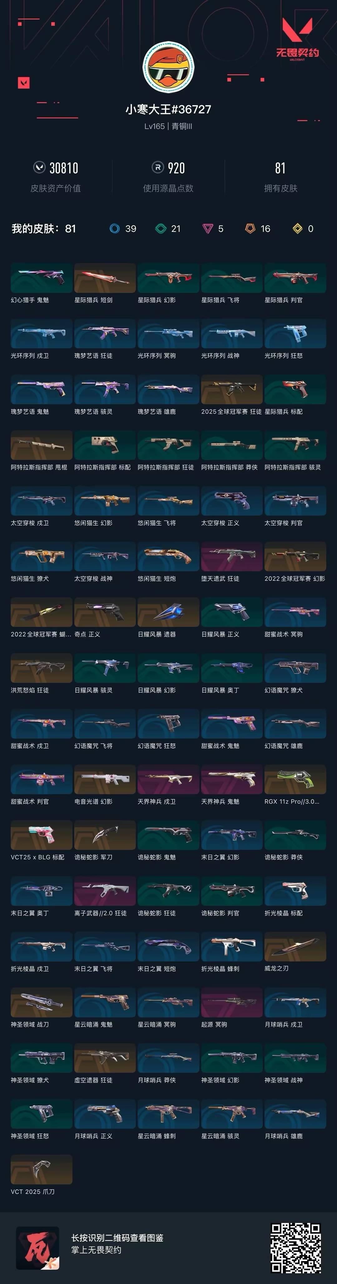 16橙皮 5紫皮 81皮肤 24英雄 115卡面 920已用源晶 青铜段位 【亮点皮肤】幻影-2022全球冠军赛蝴蝶刀-2022全球冠军赛 【套装】vcn2025套装vct 2025赛季礼包2022全球冠军赛 【近战武器皮肤】日耀风暴 遗器阿特拉斯指挥部诡秘蛇影vct 2025 爪
