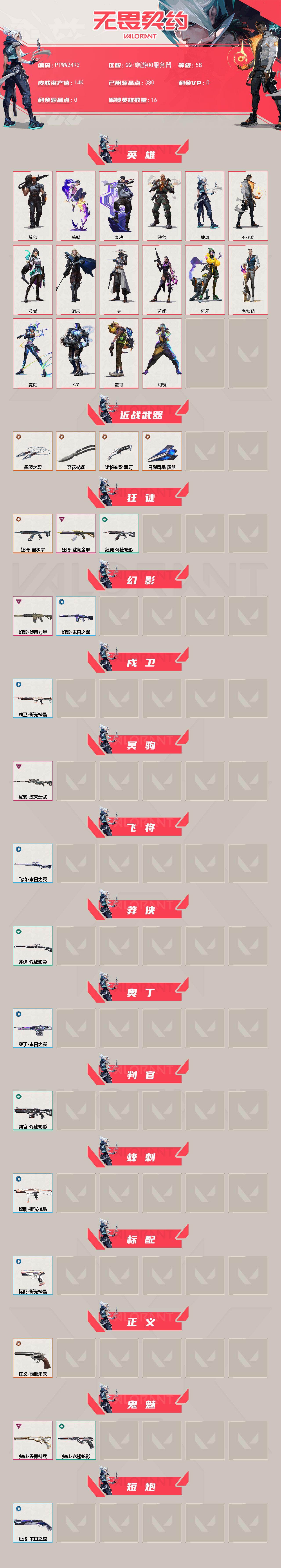 【ptww2493】终极6/卓越4/皮肤33/等级58/段位:白银/幻棱/炼狱/暮蝶/壹决/铁臂/捷风/不死鸟/贤者/猎枭/零/芮娜/奇乐/尚勃勒/霓虹/k/o/盖可/穿花蝴蝶/黑波之刃/近战武器-诡秘蛇影 军刀/近战武器-日耀风暴 遗器/塑水宗-狂徒/狂徒-紫阙金琅/狂徒-诡秘蛇影/侦察力量-幻影/幻影-末日之翼/戍卫-折光棱晶/冥驹-堕天遗武/飞将-末日之翼/莽侠-诡秘蛇影/奥丁-
