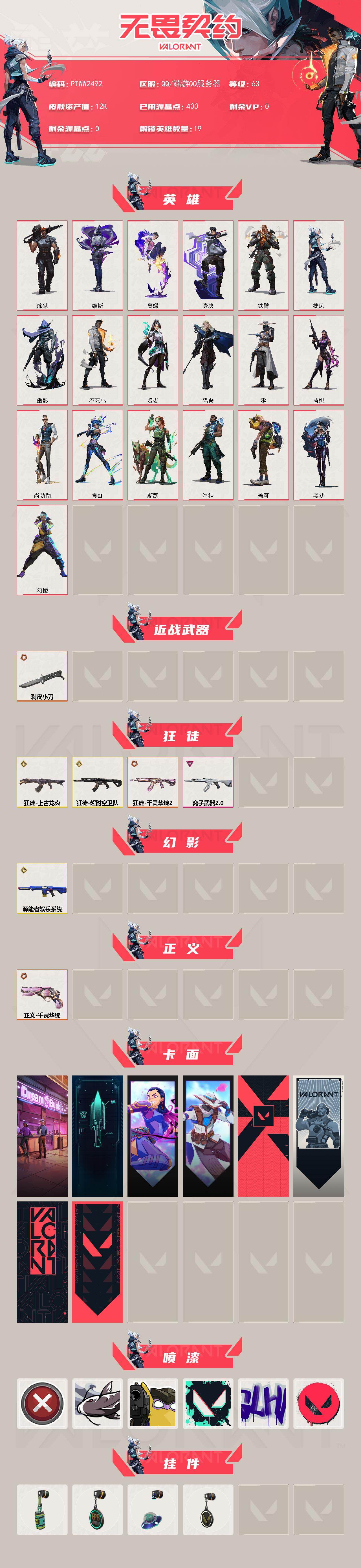 【ptww2492】终极4/传奇3/卓越1/皮肤30/等级63/段位:白银/幻棱/炼狱/维斯/暮蝶/壹决/铁臂/捷风/幽影/不死鸟/贤者/猎枭/零/芮娜/尚勃勒/霓虹/斯凯/海神/盖可/黑梦/剥皮小刀/上古龙炎-狂徒/狂徒-超时空卫队/狂徒-千灵华绽//2.0/狂徒-离子武器//2.0/源能者娱乐系统-幻影/正义-千灵华绽/梦幻奶茶 卡面/零点嗅探设计图 卡面/无畏契约go!第一卷: