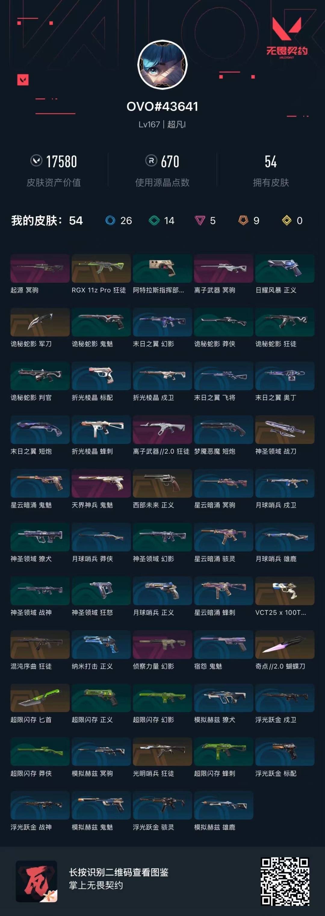 9橙皮 5紫皮 54皮肤 23英雄 92卡面 670已用源晶 超凡段位 【近战武器皮肤】匕首-超限闪存蝴蝶刀-奇点//2.0神圣领域 战刀诡秘蛇影 【佩呛皮肤】正义-西部未来标配-vct25x100t鬼魅-天界神兵 【步呛皮肤】狂徒-离子武器2.0狂徒-光明哨兵狂徒-rgx 11z