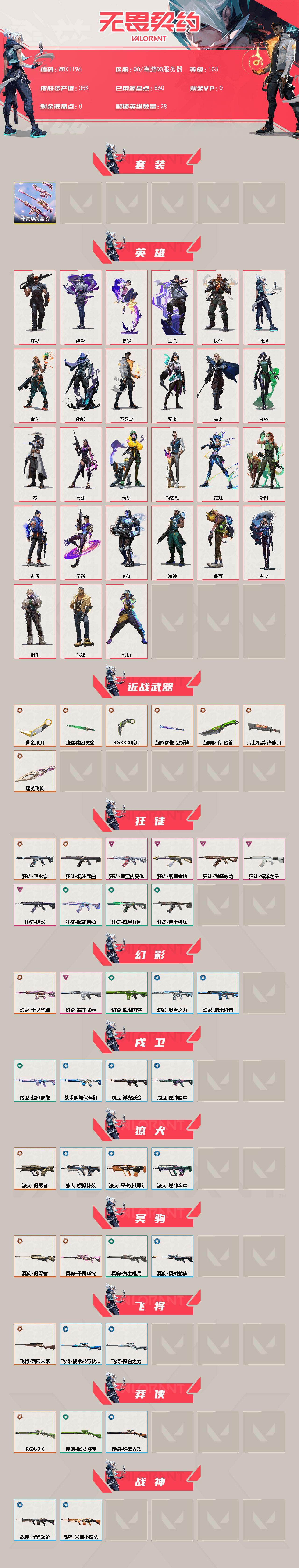 【wwx1196】终极19/卓越7/皮肤75/等级103/段位:未定级/千灵华绽套装/幻棱/炼狱/维斯/暮蝶/钛狐/壹决/铁臂/捷风/雷兹/幽影/不死鸟/贤者/猎枭/蝰蛇/零/芮娜/奇乐/尚勃勒/霓虹/斯凯/夜露/星礈/k/o/海神/盖可/黑梦/钢锁/紫金爪刀/rgx-11z-pro//3.0-爪刀/落英飞旋/流星兵团-短剑/近战武器-超能偶像 应援棒/近战武器-超限闪存 匕首/近战武