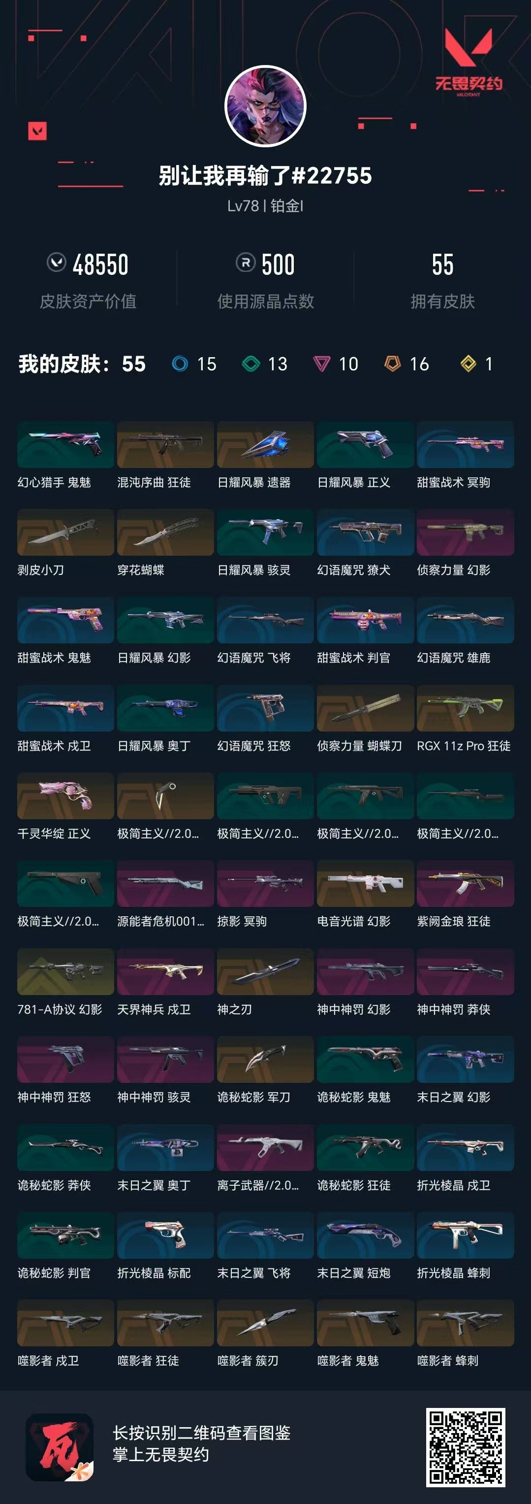 [16424955]16橙皮 1金皮 10紫皮 55皮肤 22英雄 55卡面 500已用源晶 铂金段位 【套装】:神罚套装神中神罚套装噬影者 【近战武器皮肤】:噬影者簇刃穿花蝴蝶诡秘蛇影神之刃极简主义2.0 爪刀蝴蝶刀-侦察力量剥皮小刀 【佩呛皮肤】:鬼魅-噬影者狂怒-神中神罚正义-千灵华绽 【冲锋呛皮肤】:蜂刺-噬影者骇灵-神中神罚 【霰弹呛皮肤】:雄鹿-源能者危机001 【步呛皮肤】:狂徒-混沌序曲狂徒-噬影者戍卫-噬影者狂徒-离子武器2.0幻影-神中神罚幻影-电音光谱狂徒-rgx 11z pro狂徒-紫阙金琅幻影-781-a协议幻影-侦察力量戍卫-天界神兵 【狙击呛皮肤】:莽侠-神中神罚冥驹-掠影 【挂饰】:薰衣草之心挂饰神中神挂饰神中神罚挂饰双城之战魄罗挂饰