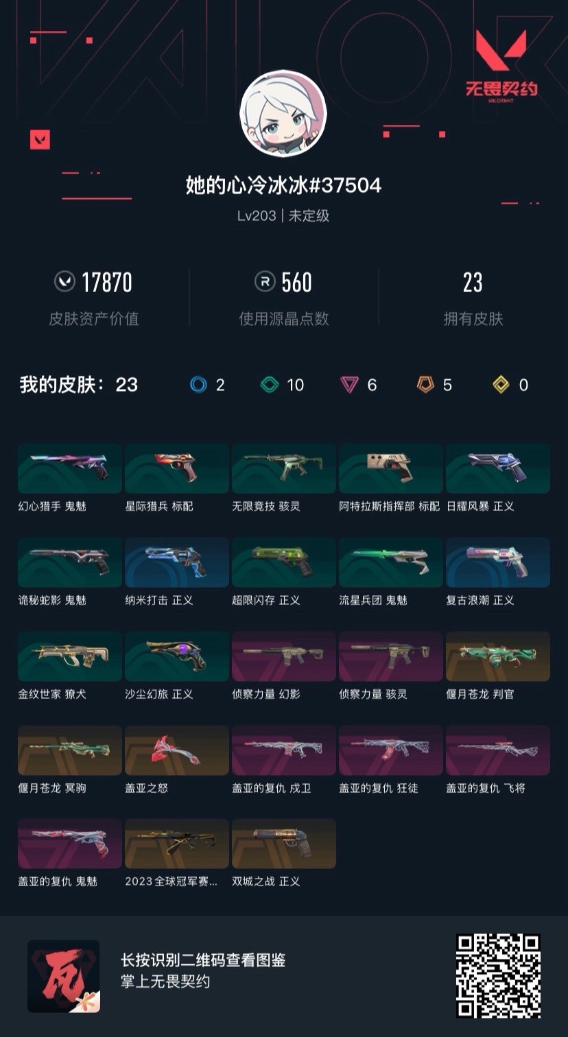 5橙皮 6紫皮 23皮肤 28英雄 102卡面 560已用源晶 未定级段位 极品小号带爆爆 【亮点皮肤】正义-双城之战狂徒-2023全球冠军赛 【套装】盖亚的复仇套装 【近战武器皮肤】盖亚之怒 【佩呛皮肤】鬼魅-盖亚的复仇 【冲锋呛皮肤】骇灵-侦察力量 【霰弹呛皮肤】判官-偃月苍龙 【步呛皮肤】狂