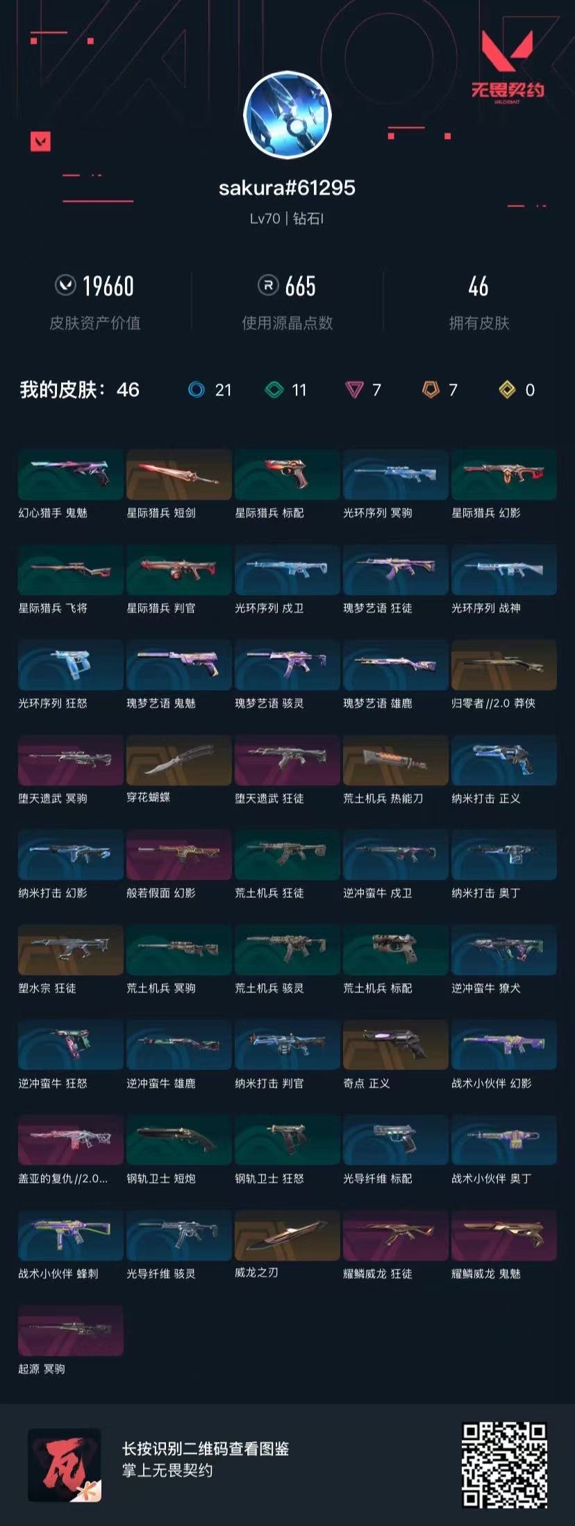 [16427262]7橙皮 7紫皮 46皮肤 21英雄 71卡面 665已用源晶 钻石段位 【套装】:耀鳞威龙套装曲奇套装 【近战武器皮肤】:穿花蝴蝶荒土机兵热能刀星际猎兵 短剑威龙之刃 【佩呛皮肤】:正义-奇点鬼魅-耀鳞威龙 【步呛皮肤】:狂徒-塑水宗狂徒-耀鳞威龙狂徒-堕天遗武幻影-盖亚的复仇2.0幻影-般若假面 【狙击呛皮肤】:莽侠-归零者//2.0冥驹-起源冥驹-堕天遗武 【挂饰】:袖珍捷风挂饰神中神挂饰耀鳞威龙挂饰双城之战小蛋糕挂饰飞刀挂饰