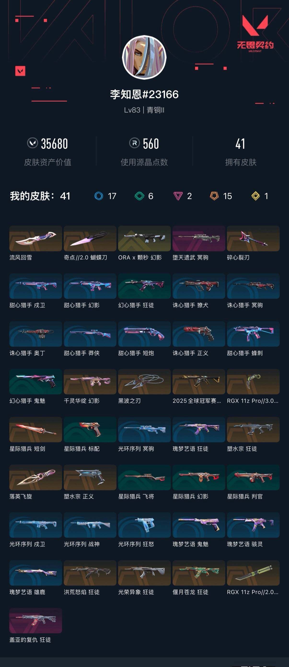 [16427715]【编号42339 可秒换绑】【25冠军狂徒全神皮肤!质量到顶!!】【英雄】:幻棱,炼狱,维斯,暮蝶,钛狐,壹决,铁臂,捷风,雷兹,幽影,不死鸟,贤者,猎枭,蝰蛇,零,芮娜,奇乐,尚勃勒,霓虹,斯凯,夜露,k/o,海神,盖可,黑梦,钢锁 【近战武器】:近战武器-流风回雪,近战武器-rgx 11z pro//2.0 蝴蝶刀,近战武器-奇点//2.0 蝴蝶刀,近战武器-rgx 11z pro//3.0 爪刀,近战武器-黑波之刃,近战武器-落英飞旋,近战武器-星际猎兵 短剑 【狂徒】:狂徒-2025全球冠军赛,狂徒-洪荒怒焰,狂徒-塑水宗,狂徒-偃月苍龙,狂徒-光荣异象,狂徒-盖亚的复仇 【幻影】:幻影-千灵华绽,幻影-a x 颗秒 【冥驹】:冥驹-堕天遗武 【正义】:正义-塑水宗 【卡面】:树懒大作战 卡面,clutch 卡面,无畏契约go!第一卷:芮娜 卡面,无畏契约go!第一卷:零 卡面,别冒尖 卡面,代号红色 卡面,新兵报到 卡面,v契约 卡面,无畏契约 卡面 【喷漆】:小丑猫 喷漆,霓光四射 喷漆,买装还是存钱 喷漆,红鳞 喷漆,暴走萝莉 喷漆,胜利属于无畏契约 喷漆,glhf 喷漆,无畏契约 喷漆 【挂饰】:鱼骨头 挂饰,动力机箱 挂饰,天外飞客 挂饰,红鳞松叶 挂饰,《双城之战》魄罗 挂饰,无畏契约 纪念币 挂饰