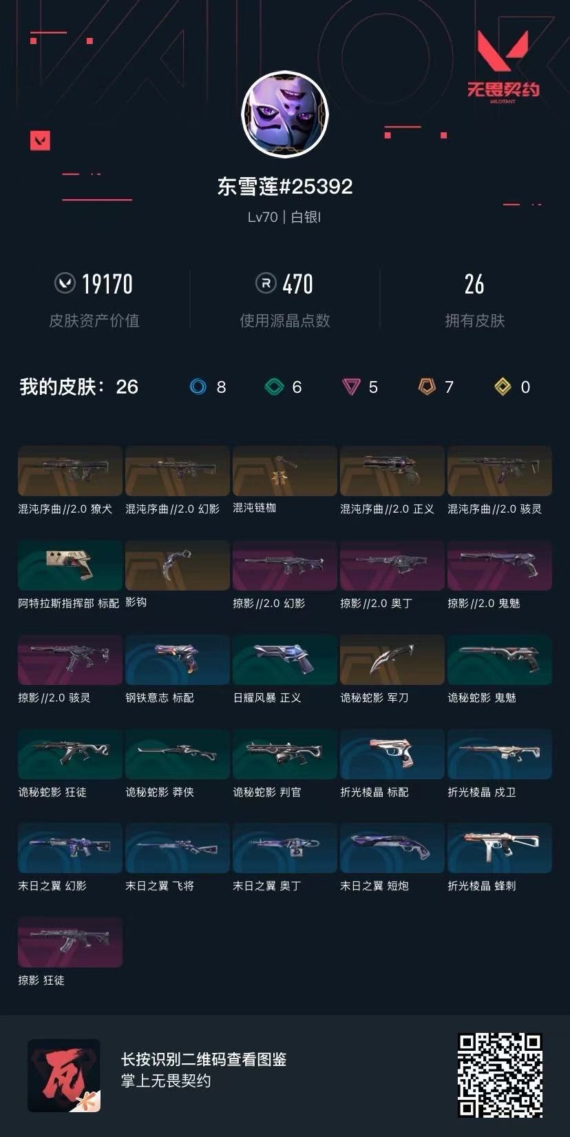 [16428247]7橙皮 5紫皮 26皮肤 14英雄 49卡面 470已用源晶 白银段位 【套装】:掠影2.0套装曲奇套装 【近战武器皮肤】:诡秘蛇影混沌链枷影钩 【佩呛皮肤】:鬼魅-掠影2.0正义-混沌序曲2.0 【冲锋呛皮肤】:骇灵-掠影2.0骇灵-混沌序曲2.0 【步呛皮肤】:狂徒-掠影獠犬-混沌序曲2.0幻影-混沌序曲2.0幻影-掠影2.0 【机呛皮肤】:奥丁-掠影2.0 【挂饰】:薰衣草之心挂饰神中神挂饰