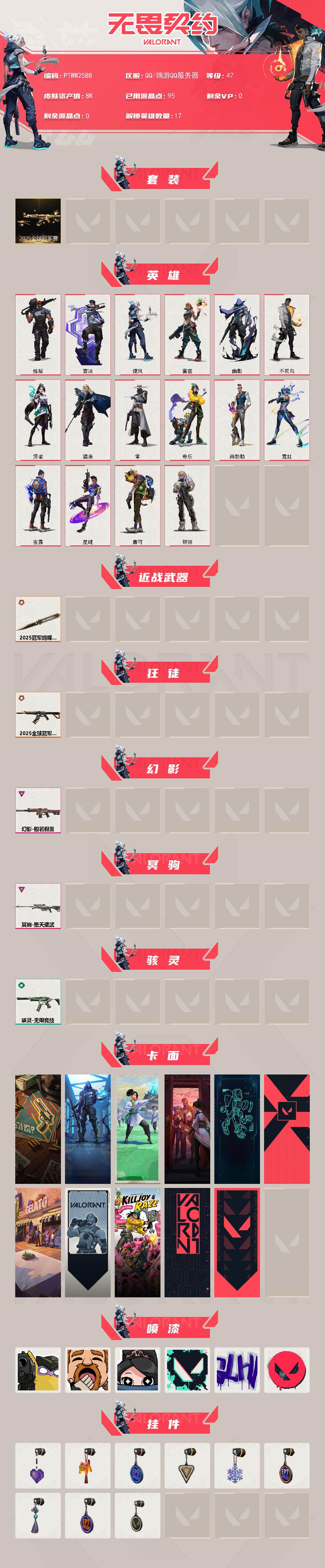 【套装】:2025全球冠军赛套装 【英雄】:炼狱,壹决,捷风,雷兹,幽影,不死鸟,贤者,猎枭,零,奇乐,尚勃勒,霓虹,夜露,星礈,盖可,钢锁 【近战武器】:近战武器-2025全球冠军赛 蝴蝶刀 【狂徒】:狂徒-2025全球冠军赛 【幻影】:幻影-般若假面 【冥驹】:冥驹-堕天遗武 【骇灵】:骇灵-无限竞技 【卡面】:正义的化身 卡面,暗呛 卡面,夯实根基 卡面,热烈欢迎 卡面,铁臂设计图 卡面