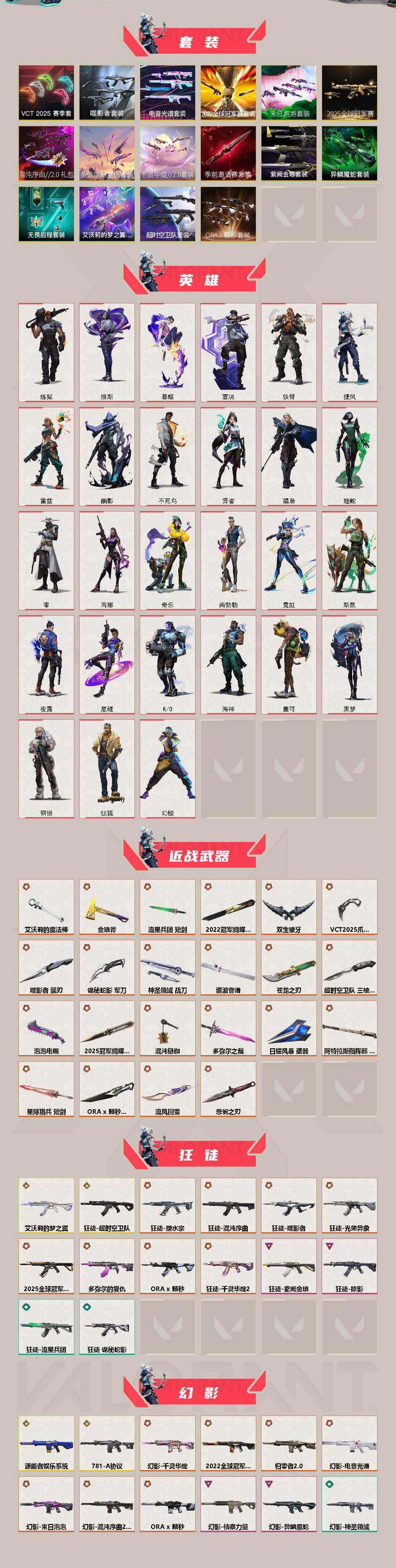 [16435669]k1285/可二次/【总资产:197835/掌瓦:017248310】【套装】:2025全球冠军赛套装,2022全球冠军赛套装,超时空卫队套装,艾沃莉的梦之翼套装,无畏契约季前邀请赛套装,千灵华绽//2.0套装,a x 颗秒套装,多弥尔的复仇套装,混沌序曲//2.0套装,末日泡泡套装,电音光谱套装,噬影者套装,vct 2025 赛季套装,异鳞魔蛇套装,紫阙金琅套装,无畏启程套装【英雄】:幻棱,炼狱,维斯,暮蝶,钛狐,壹决,铁臂,捷风,雷兹,幽影,不死鸟,贤者,猎枭,蝰蛇,零,芮娜,奇乐,尚勃勒,霓虹,斯凯,夜露,星礈,k/o,海神,盖可,黑梦,钢锁【近战武器】:近战武器-2025全球冠军赛 蝴蝶刀,近战武器-2022全球冠军赛 蝴蝶刀,近战武器-无畏契约季前邀请赛 悲悯之刃,近战武器-流风回雪,近战武器-a x 颗秒 军刀,近战武器-多弥尔之裁,近战武器-混沌链枷,近战武器-泡泡电锯,近战武器-超时空卫队 三棱军刺,近战武器-5周年//公测重制版 苍龙之刃,近战武器-谐波音谱,近战武器-vct 2025 爪刀,近战武器-噬影者 簇刃,近战武器-艾沃莉的魔法棒,近战武器-双生獠牙,近战武器-流星兵团 短剑,近战武器-金琅斧,近战武器-诡秘蛇影 军刀,近战武器-神圣领域 战刀,近战武器-日耀风暴 遗器,近战武器-阿特拉斯指挥部 甩棍,近战武器-星际猎兵 短剑【狂徒】:狂徒-艾沃莉的梦之翼,狂徒-超时空卫队,狂徒-2025全球冠军赛,狂徒-混沌序曲,狂徒-塑水宗,狂徒-噬影者,狂徒-光荣异象,狂徒-多弥尔的复仇,狂徒-a x 颗秒,狂徒-千灵华绽//2.0,狂徒-掠影,狂徒-紫阙金琅,狂徒-流星兵团,狂徒-诡秘蛇影【幻影】:幻影-781-a协议,幻影-源能者娱乐系统,幻影-2022全球冠军赛,幻影-归零者//2.0,幻影-千灵华绽,幻影-电音光谱,幻影-末日泡泡,幻影-混沌序曲//2.0,幻影-a x 颗秒,幻影-侦察力量,幻影-异鳞魔蛇,幻影-神圣领域,幻影-白日幻梦,幻影-末日之翼,幻影-电音光谱【戍卫】:戍卫-破败军械,戍卫-噬影者,戍卫-电音光谱,戍卫-多弥尔的复仇,戍卫-掠影,戍卫-紫阙金琅,戍卫-战术熊与伙伴们,戍卫-月球哨兵,戍卫-折光棱晶,戍卫-电音光谱【獠犬】:獠犬-781-a协议,獠犬-超时空卫队,獠犬-电音光谱,獠犬-混沌序曲//2