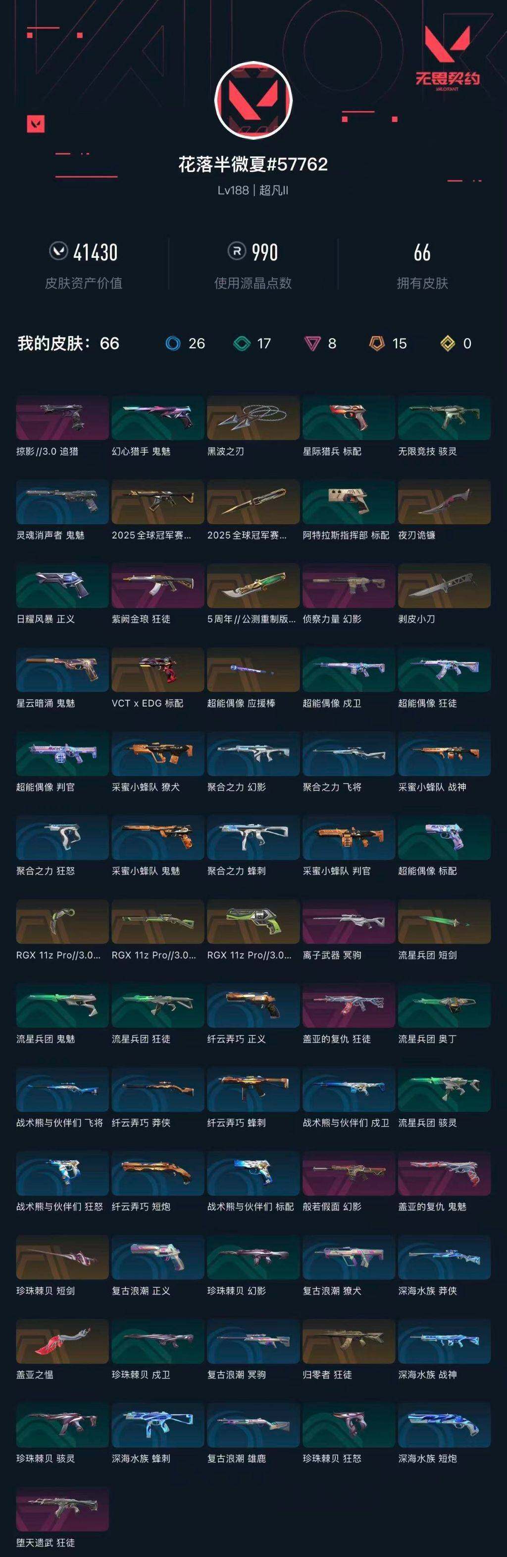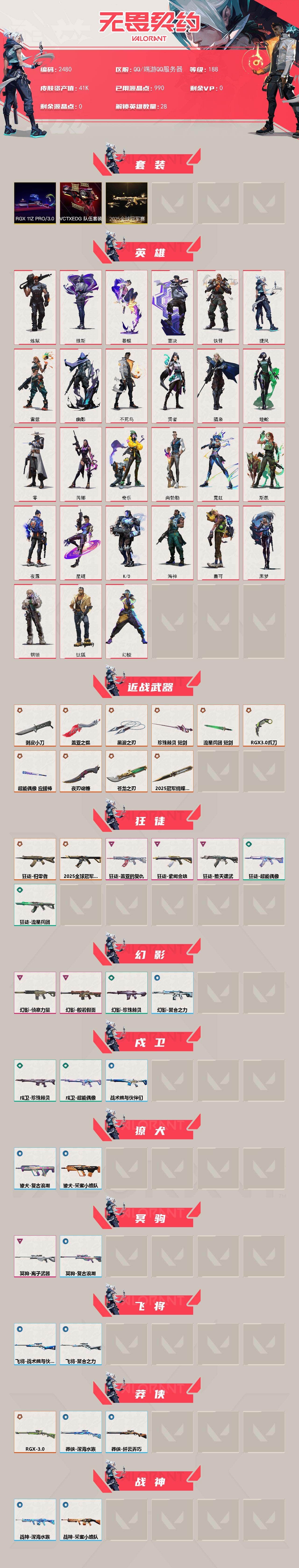 [16435822]【套装】:2025全球冠军赛套装,rgx 11z pro//3.0套装,vctxedg 队伍套装 【英雄】:幻棱,炼狱,维斯,暮蝶,钛狐,壹决,铁臂,捷风,雷兹,幽影,不死鸟,贤者,猎枭,蝰蛇,零,芮娜,奇乐,尚勃勒,霓虹,斯凯,夜露,星礈,k/o,海神,盖可,黑梦,钢锁 【近战武器】:近战武器-2025全球冠军赛 蝴蝶刀,近战武器-5周年//公测重制版 苍龙之刃,近战武器-剥皮小刀,近战武器-rgx 11z pro//3.0 爪刀,近战武器-黑波之刃,近战武器-珍珠棘贝 短剑,近战武器-流星兵团 短剑,近战武器-超能偶像 应援棒,近战武器-盖亚之愠,近战武器-夜刃诡镰 【狂徒】:狂徒-2025全球冠军赛,狂徒-归零者,狂徒-堕天遗武,狂徒-盖亚的复仇,狂徒-紫阙金琅,狂徒-超能偶像,狂徒-流星兵团 【幻影】:幻影-般若假面,幻影-侦察力量,幻影-珍珠棘贝,幻影-聚合之力 【戍卫】:戍卫-超能偶像,戍卫-珍珠棘贝,戍卫-战术熊与伙伴们 【獠犬】:獠犬-采蜜小蜂队,獠犬-复古浪潮 【冥驹】:冥驹-离子武器,冥驹-复古浪潮 【飞将】:飞将-聚合之力,飞将-战术熊与伙伴们 【莽侠】:莽侠-rgx 11z pro//3.0,莽侠-深海水族,莽侠-纤云弄巧 【战神】:战神-采蜜小蜂队,战神-深海水族 【奥丁】:奥丁-流星兵团 【判官】:判官-超能偶像,判官-采蜜小蜂队 【雄鹿】:雄鹿-复古浪潮 【骇灵】:骇灵-流星兵团,骇灵-珍珠棘贝,骇灵-无限竞技 【蜂刺】:蜂刺-聚合之力,蜂刺-深海水族,蜂刺-纤云弄巧 【追猎】:追猎-掠影//3.0 【标配】:标配-超能偶像,标配-战术熊与伙伴们 【vct手呛】:标配-vct x edg 【正义】:正义-rgx 11z pro//3.0,正义-复古浪潮,正义-纤云弄巧 【鬼魅】:鬼魅-盖亚的复仇,鬼魅-流星兵团,鬼魅-采蜜小蜂队,鬼魅-灵魂消声者,鬼魅-星云暗涌 【狂怒】:狂怒-珍珠棘贝,狂怒-聚合之力,狂怒-战术熊与伙伴们 【短炮】:短炮-深海水族,短炮-纤云弄巧 【卡面】:《双城之战》拥抱 卡面,精灵大战 卡面,欢迎来到底城 卡面,南瓜盛典 卡面,vct cn首冠 卡面,修车达人 卡面,正义的化身 卡面,终章:生意人麦宝 卡面,铁之华 卡面,失而复得 卡面,时间到 卡面,最高舞台 卡面,复活专家 卡面,归乡 // 蝰蛇 卡面,rg