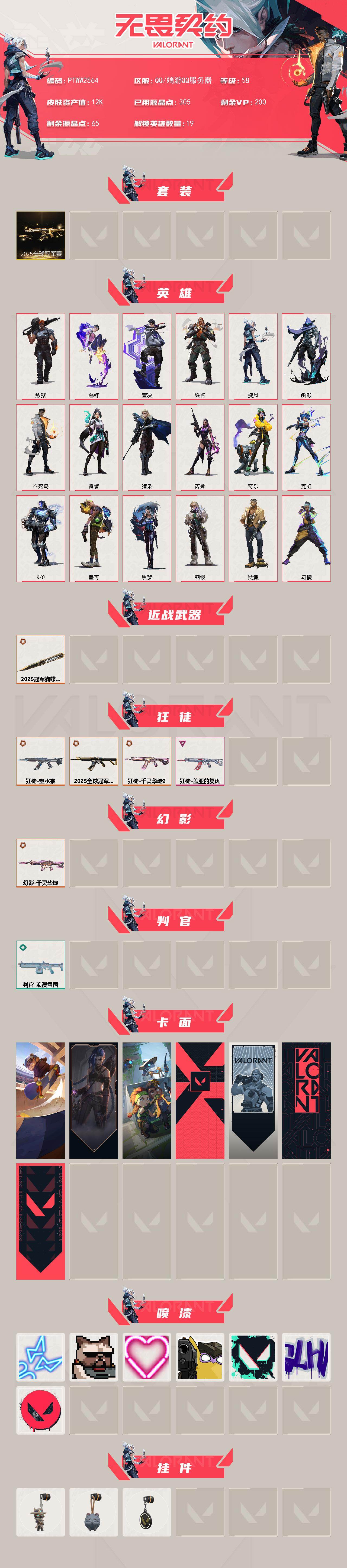 【套装】:2025全球冠军赛套装 【英雄】:幻棱,炼狱,暮蝶,钛狐,壹决,铁臂,捷风,幽影,不死鸟,贤者,猎枭,芮娜,奇乐,霓虹,k/o,盖可,黑梦,钢锁 【近战武器】:近战武器-2025全球冠军赛 蝴蝶刀 【狂徒】:狂徒-2025全球冠军赛,狂徒-塑水宗,狂徒-千灵华绽//2.0,狂徒-盖亚的复仇 【幻影】:幻影-千灵华绽 【判官】:判官-浪漫雪国 【卡面】:clutch 卡面,《双城之战》