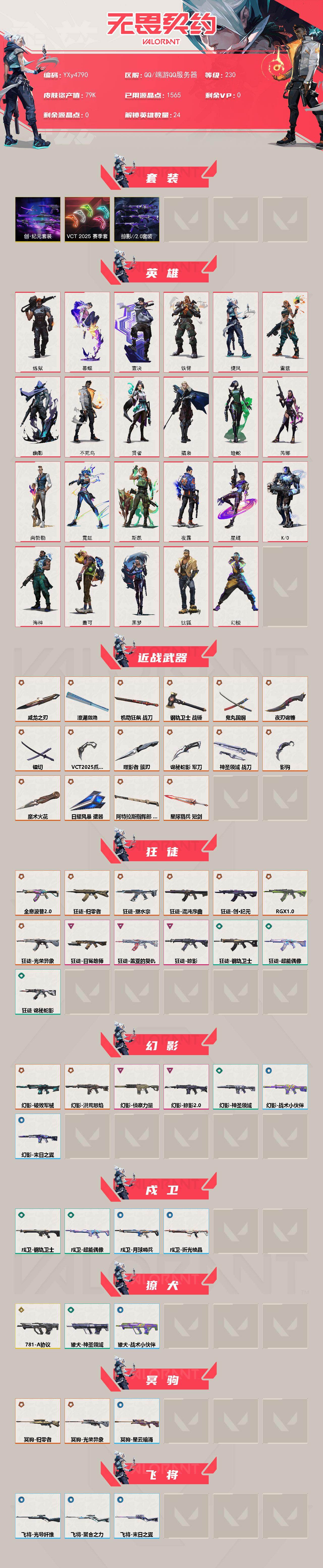 【7.9w库存vct爪刀.创纪元套装.威龙之刃.太刀.古神镰刀.簇刃.电工钳.掠夺爪.十狂徒四幻影光荣异象.显卡.塑水宗.混沌.流脓.破败】y4790【无二次】【因赛季更新游戏段付以上号为准!】 【套装】:vct 2025 赛季套装,创·纪元套装,掠影//2.0套装 【英雄】:幻棱,炼狱,暮蝶,钛狐,壹决,铁臂,捷风,雷兹,幽影,不死鸟,贤者,猎枭,蝰蛇,芮娜,尚勃勒,霓虹,斯凯,夜露,星
