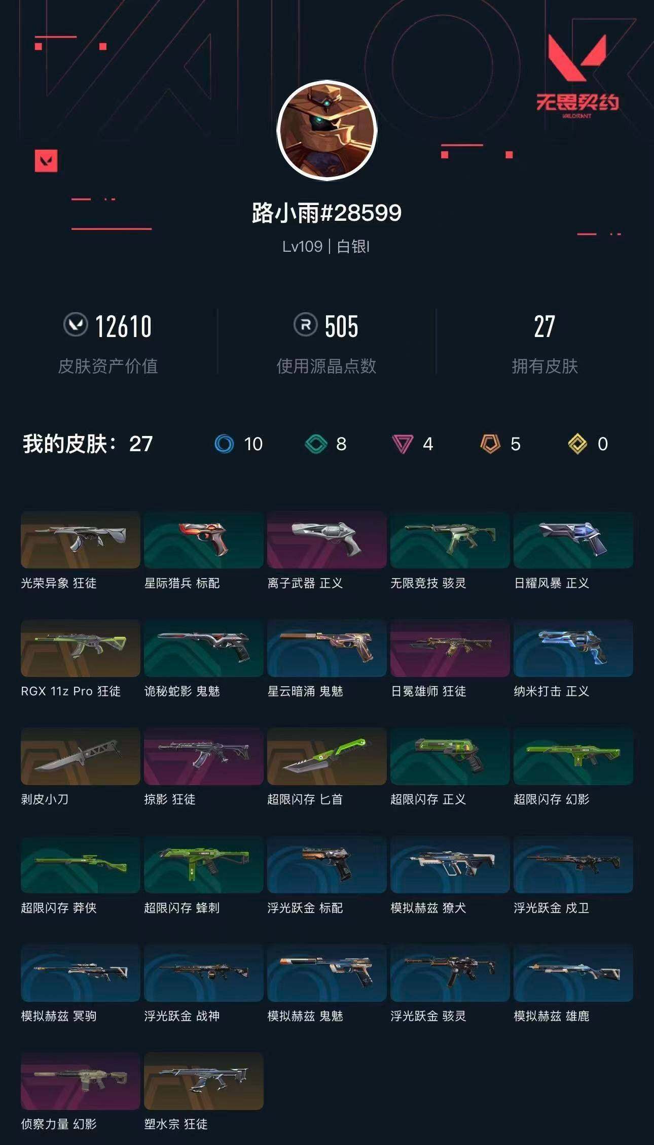 [16440177]【英雄】:幻棱,炼狱,维斯,暮蝶,钛狐,壹决,铁臂,捷风,雷兹,幽影,不死鸟,贤者,猎枭,蝰蛇,零,芮娜,奇乐,尚勃勒,霓虹,斯凯,夜露,星礈,k/o,盖可,黑梦,钢锁 【近战武器】:近战武器-剥皮小刀,近战武器-超限闪存 匕首 【狂徒】:狂徒-塑水宗,狂徒-rgx 11z pro,狂徒-光荣异象,狂徒-掠影,狂徒-日冕雄师 【幻影】:幻影-侦察力量,幻影-超限闪存 【戍卫】:戍卫-浮光跃金 【獠犬】:獠犬-模拟赫兹 【冥驹】:冥驹-模拟赫兹 【莽侠】:莽侠-超限闪存 【战神】:战神-浮光跃金 【雄鹿】:雄鹿-模拟赫兹 【骇灵】:骇灵-无限竞技,骇灵-浮光跃金 【蜂刺】:蜂刺-超限闪存 【标配】:标配-浮光跃金 【正义】:正义-离子武器,正义-超限闪存,正义-纳米打击 【鬼魅】:鬼魅-诡秘蛇影,鬼魅-模拟赫兹,鬼魅-星云暗涌 【卡面】:终章:激斗汉堡 卡面,进入射程 卡面,《双城之战》拥抱 卡面,精灵大战 卡面,欢迎来到底城 卡面,南瓜盛典 卡面,唱片的故事 卡面,钢弓与箭弦 卡面,排除故障 卡面,战术桌游 卡面,悠享食光 卡面,修车达人 卡面,模拟赫兹 卡面,浮光跃金 卡面,超限闪存 卡面,维斯工牌 卡面,正义的化身 卡面,时间到 卡面,最高舞台 卡面,先瓦为敬 银色 卡面,树懒大作战 卡面,声感陷阱设计图 卡面,clutch 卡面,梦幻奶茶 卡面,零点嗅探设计图 卡面,无畏契约go!第一卷:芮娜 卡面,无畏契约go!第一卷:零 卡面,《双城之战》金克丝 卡面,没有什么能逃过我的眼睛 卡面,代号红色 卡面,新兵报到 卡面,v契约 卡面,无畏契约 卡面 【喷漆】:嗨宝南瓜灯 喷漆,嘭! 喷漆,都算到了 喷漆,控场勿近 喷漆,皮蛋呼呼 喷漆,像素星礈 喷漆,图谋不轨的零 喷漆,小丑猫 喷漆,模拟赫兹 喷漆,高丽风情小熊 喷漆,蹲到一个 喷漆,全力集中 喷漆,超限闪存 喷漆,rua一下 喷漆,熊抱 喷漆,高丽风情小虎 喷漆,记在小本本 喷漆,防弹企鹅 喷漆,高丽风情小蛙 喷漆,超级粉丝 喷漆,捷风差距 喷漆,惊声尖叫 喷漆,拼一呛 喷漆,买装还是存钱 喷漆,酷熊冲浪 喷漆,无畏契约go!第一卷:捷风 喷漆,飓刃涂鸦 喷漆 ,胜利属于无畏契约 喷漆,glhf 喷漆,无畏契约 喷漆 【挂饰】:终章:猫猫木乃伊 挂饰,悠闲鸡块 挂饰,伞绳 挂饰,《双城之战》小蛋糕 挂饰