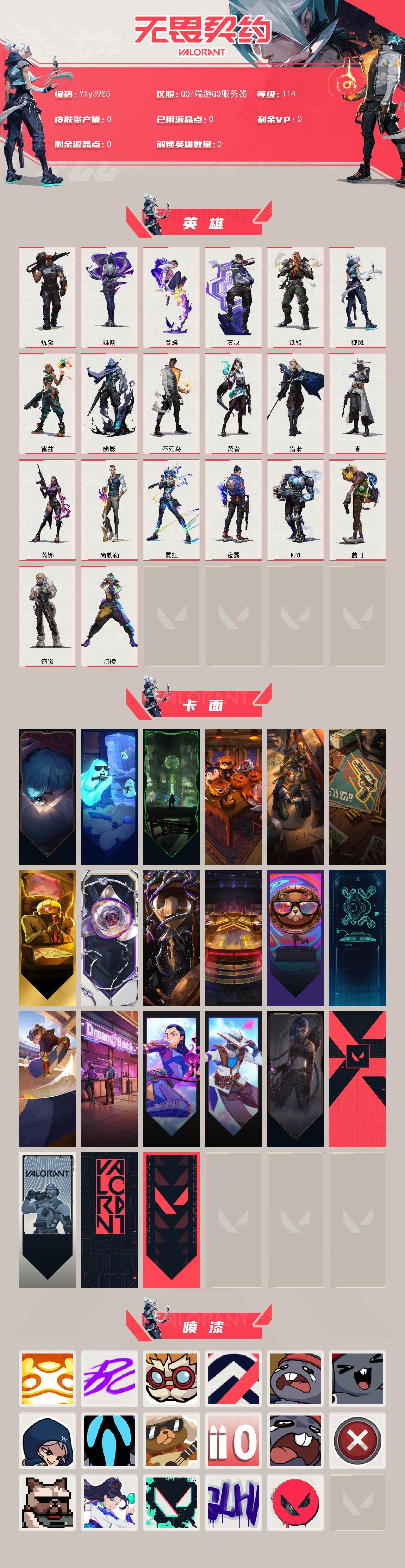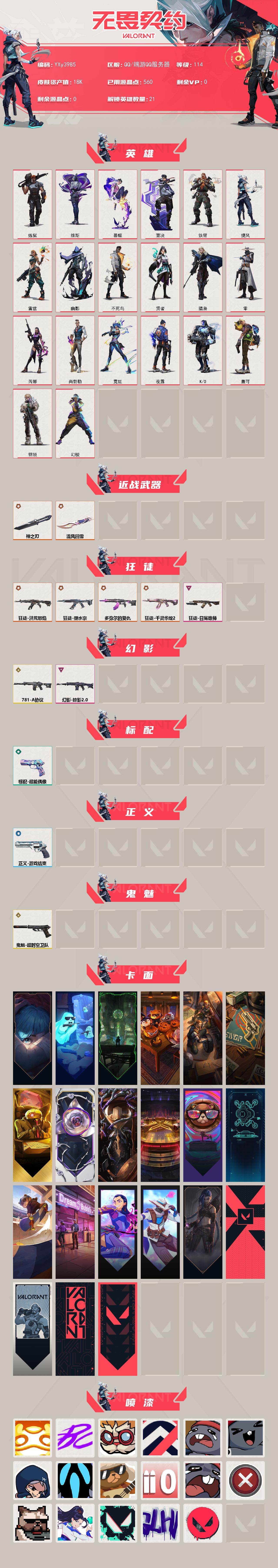 【1.8w库存神之刃.莲花扇.五狂徒双幻影流脓.塑水宗.多弥尔.莲花.狮子.781协议.掠夺2.0.超时空鬼魅】yxy3985【无二次】【因赛季更新游戏段付以上号为准!】 【英雄】:幻棱,炼狱,维斯,暮蝶,壹决,铁臂,捷风,雷兹,幽影,不死鸟,贤者,猎枭,零,芮娜,尚勃勒,霓虹,夜露,k/o,盖可,钢锁 【近战武器】:近战武器-流风回雪,近战武器-神之刃 【狂徒】:狂徒-洪荒怒焰,狂徒-塑水宗,狂徒-多弥尔的复仇,狂徒-千灵华绽//2.0,狂徒-日冕雄师 【幻影】:幻影-781-a协议,幻影-掠影//2.0 【标配】:标配-超能偶像 【正义】:正义-游戏结束 【鬼魅】:鬼魅-超时空卫队 【卡面】:《双城之战》拥抱 卡面,精灵大战 卡面,欢迎来到底城 卡面,南瓜盛典 卡面,修车达人 卡面,正义的化身 卡面,终章:生意人麦宝 卡面,铁之华 卡面,时间到 卡面,最高舞台 卡面,音熊登场 卡面,声感陷阱设计图 卡面,clutch 卡面,梦幻奶茶 卡面,无畏契约go!第一卷:芮娜 卡面,无畏契约go!第一卷:零 卡面,《双城之战》金克丝 卡面,代号红色 卡面,新兵报到 卡面,v契约 卡面,无畏契约 卡面 【喷漆】:嗨宝南瓜灯 喷漆,嘭! 喷漆,都算到了 喷漆,控场勿近 喷漆,熊抱 喷漆,超级粉丝 喷漆,捷风差距 喷漆,惊声尖叫 喷漆,战术熊的巴拉莱卡琴 喷漆,拼一呛 喷漆,我的刀呢? 喷漆,买装还是存钱 喷漆,关门放狗 喷漆,无畏契约go!第一卷:贤者 喷漆,胜利属于无畏契约 喷漆,glhf 喷漆,无畏契约 喷漆 【挂饰】:悠闲鸡块 挂饰,伞绳 挂饰,《双城之战》小蛋糕 挂饰,第九季//第三幕 纪念币 挂饰,无畏契约go!第一卷 芮娜 挂饰,无畏契约go!第一卷 零 挂饰,熔岩灯 挂饰,第九季//第二幕 纪念币 挂饰,终章:这瓜保熟 挂饰,糖葫芦 挂饰,袖珍捷风 挂饰,丢麦 挂饰,迷你浓缩 挂饰,尤克里里 挂饰,第九季//第一幕 纪念币 挂饰,天外飞客 挂饰,《双城之战》魄罗 挂饰,海豹的认可 挂饰,无畏契约 纪念币 挂饰