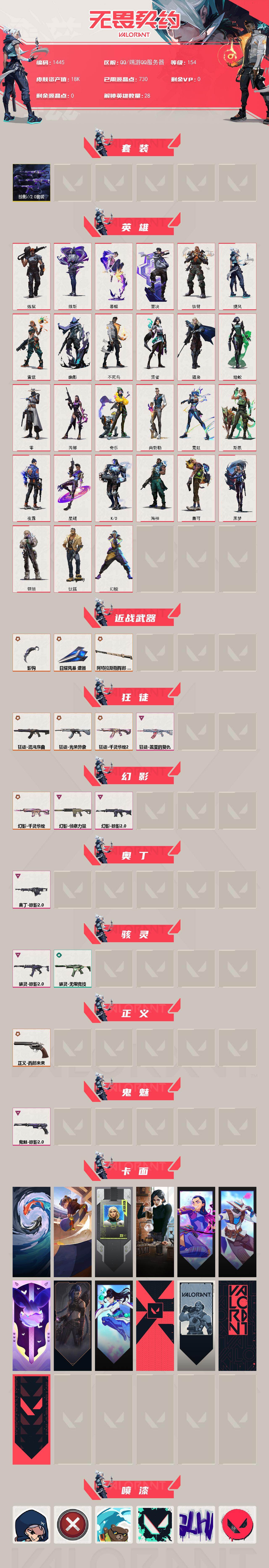 【1445】xl01980 【套装】:掠影//2.0套装 【英雄】:幻棱,炼狱,维斯,暮蝶,钛狐,壹决,铁臂,捷风,雷兹,幽影,不死鸟,贤者,猎枭,蝰蛇,零,芮娜,奇乐,尚勃勒,霓虹,斯凯,夜露,星礈,k/o,海神,盖可,黑梦,钢锁 【近战武器】:近战武器-影钩,近战武器-日耀风暴 遗器,近战武器-阿特拉斯指挥部 甩棍 【狂徒】:狂徒-混沌序曲,狂徒-光荣异象,狂徒-千灵华绽//2.0,狂徒-盖亚的复仇 【幻影】:幻影-千灵华绽,幻影-侦察力量,幻影-掠影//2.0 【奥丁】:奥丁-掠影//2.0 【骇灵】:骇灵-掠影//2.0,骇灵-无限竞技 【正义】:正义-西部未来 【鬼魅】:鬼魅-掠影//2.0 【卡面】:红鳞松叶 卡面,clutch 卡面,钢锁工牌 卡面,虹吸式咖啡壶 卡面,无畏契约go!第一卷:芮娜 卡面,无畏契约go!第一卷:零 卡面,化茧成蝶 卡面,《双城之战》金克丝 卡面,无畏契约go!第一卷:贤者 卡面,代号红色 卡面,新兵报到 卡面,v契约 卡面,无畏契约 卡面 【喷漆】:捷风差距 喷漆,买装还是存钱 喷漆,酷熊冲浪 喷漆,胜利属于无畏契约 喷漆,glhf 喷漆,无畏契约 喷漆 【挂饰】:无畏契约go!第一卷 芮娜 挂饰,无畏契约go!第一卷 零 挂饰,天外飞客 挂饰,无畏契约 纪念币 挂饰