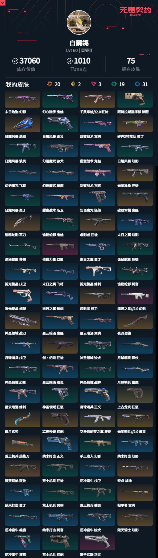 wl625//【账号状态】无封号/【区服】qq/【游戏等级】lv160/【游戏段位】青铜ii/【剩余v点】549/【剩余r点】20/【皮肤资产价值】37060/【使用r点】1010/【英雄数量】28/【皮肤数量】75/【卡面数量】99/【喷漆数量】87/【挂件数量】76/【拥有套装】/【拥有近战武器