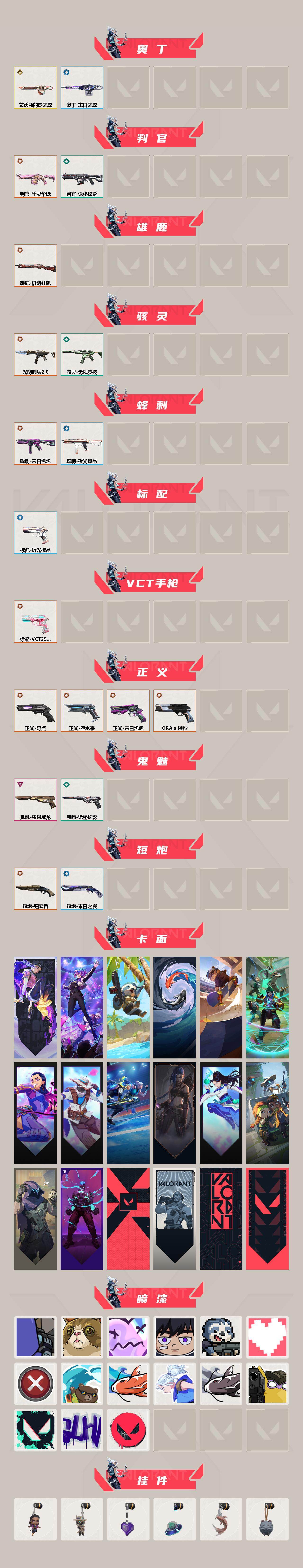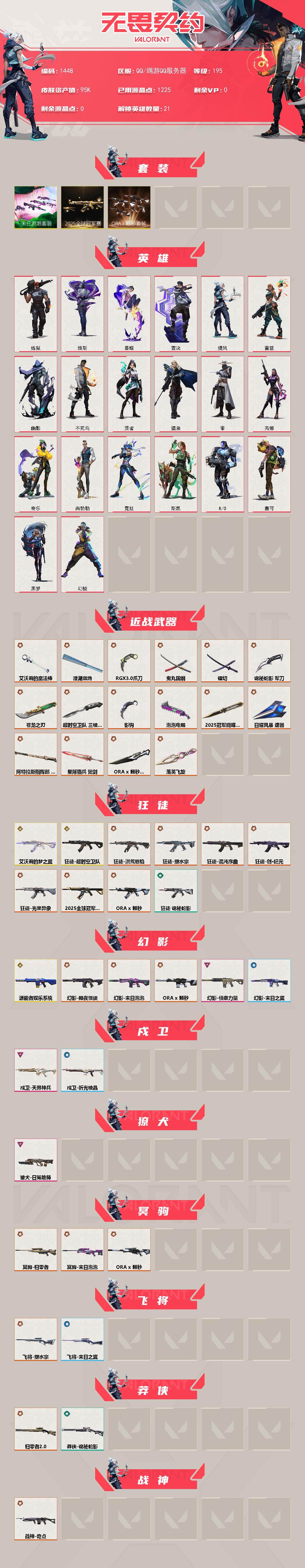 【1448】xl190599 【套装】:2025全球冠军赛套装,a x 颗秒套装,末日泡泡套装 【英雄】:幻棱,炼狱,维斯,暮蝶,壹决,捷风,雷兹,幽影,不死鸟,贤者,猎枭,零,芮娜,奇乐,尚勃勒,霓虹,斯凯,k/o,盖可,黑梦 【近战武器】:近战武器-2025全球冠军赛 蝴蝶刀,近战武器-a x 颗秒 军刀,近战武器-泡泡电锯,近战武器-影钩,近战武器-超时空卫队 三棱军刺,近战武器-5周年//公测重制版 苍龙之刃,近战武器-rgx 11z pro//3.0 爪刀,近战武器-落英飞旋,近战武器-镭切,近战武器-艾沃莉的魔法棒,近战武器-澄湖潋滟,近战武器-鬼丸国纲,近战武器-诡秘蛇影 军刀,近战武器-日耀风暴 遗器,近战武器-阿特拉斯指挥部 甩棍,近战武器-星际猎兵 短剑 【狂徒】:狂徒-艾沃莉的梦之翼,狂徒-超时空卫队,狂徒-2025全球冠军赛,狂徒-洪荒怒焰,狂徒-混沌序曲,狂徒-塑水宗,狂徒-创·纪元,狂徒-光荣异象,狂徒-a x 颗秒,狂徒-诡秘蛇影 【幻影】:幻影-源能者娱乐系统,幻影-黯夜怪谈,幻影-末日泡泡,幻影-a x 颗秒,幻影-侦察力量,幻影-末日之翼 【戍卫】:戍卫-天界神兵,戍卫-折光棱晶 【獠犬】:獠犬-日冕雄师 【冥驹】:冥驹-归零者,冥驹-末日泡泡,冥驹-a x 颗秒 【飞将】:飞将-塑水宗,飞将-末日之翼 【莽侠】:莽侠-归零者//2.0,莽侠-诡秘蛇影 【战神】:战神-奇点 【奥丁】:奥丁-艾沃莉的梦之翼,奥丁-末日之翼 【判官】:判官-千灵华绽,判官-诡秘蛇影 【雄鹿】:雄鹿-机动狂飙 【骇灵】:骇灵-光明哨兵//2.0,骇灵-无限竞技 【蜂刺】:蜂刺-末日泡泡,蜂刺-折光棱晶 【标配】:标配-折光棱晶 【vct手呛】:标配-vct25 x blg 【正义】:正义-奇点,正义-塑水宗,正义-末日泡泡,正义-a x 颗秒 【鬼魅】:鬼魅-耀鳞威龙,鬼魅-诡秘蛇影 【短炮】:短炮-归零者,短炮-末日之翼 【卡面】:无畏契约:暮蝶 卡面,超能偶像 卡面,树懒大作战 卡面,红鳞松叶 卡面,clutch 卡面,哨卫者之领域 卡面,无畏契约go!第一卷:芮娜 卡面,无畏契约go!第一卷:零 卡面,比比看谁快? 卡面,《双城之战》金克丝 卡面,无畏契约go!第一卷:贤者 卡面,别冒尖 卡面,黑影先生的咖啡! 卡面,势不可挡//k/o 卡面,代号红色 卡面,新兵报到 卡面,v契约 卡面,无畏契约 卡面,809特遣队 卡面 【喷漆】:他们将落荒而逃 喷漆,啊? 喷漆,伤心心 喷漆,全力集中 喷漆,审判之爪 喷漆,双击点赞 喷漆,买装还是存钱 喷漆,酷熊冲浪 喷漆,红鳞 喷漆,无畏契约go!第一卷:捷风 喷漆,松叶 喷漆,放下武器 喷漆,胜利属于无畏契约 喷漆,glhf 喷漆,无畏契约 喷漆 【挂饰】:v25第六幕:超凡 挂饰,无畏契约go!第一卷 芮娜 挂饰,无畏契约go!第一卷 零 挂饰,薰衣草之心 挂饰,天外飞客 挂饰,红鳞松叶 挂饰,《双城之战》魄罗 挂饰,无畏契约 纪念币 挂饰