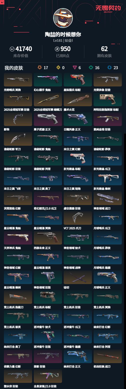 wl626//【账号状态】无封号/【区服】qq/【游戏等级】lv181/【游戏段位】铂金i/【剩余v点】86/【剩余r点】100/【皮肤资产价值】41740/【使用r点】950/【英雄数量】28/【皮肤数量】62/【卡面数量】121/【喷漆数量】83/【挂件数量】76/【拥有套装】2025全球冠军赛