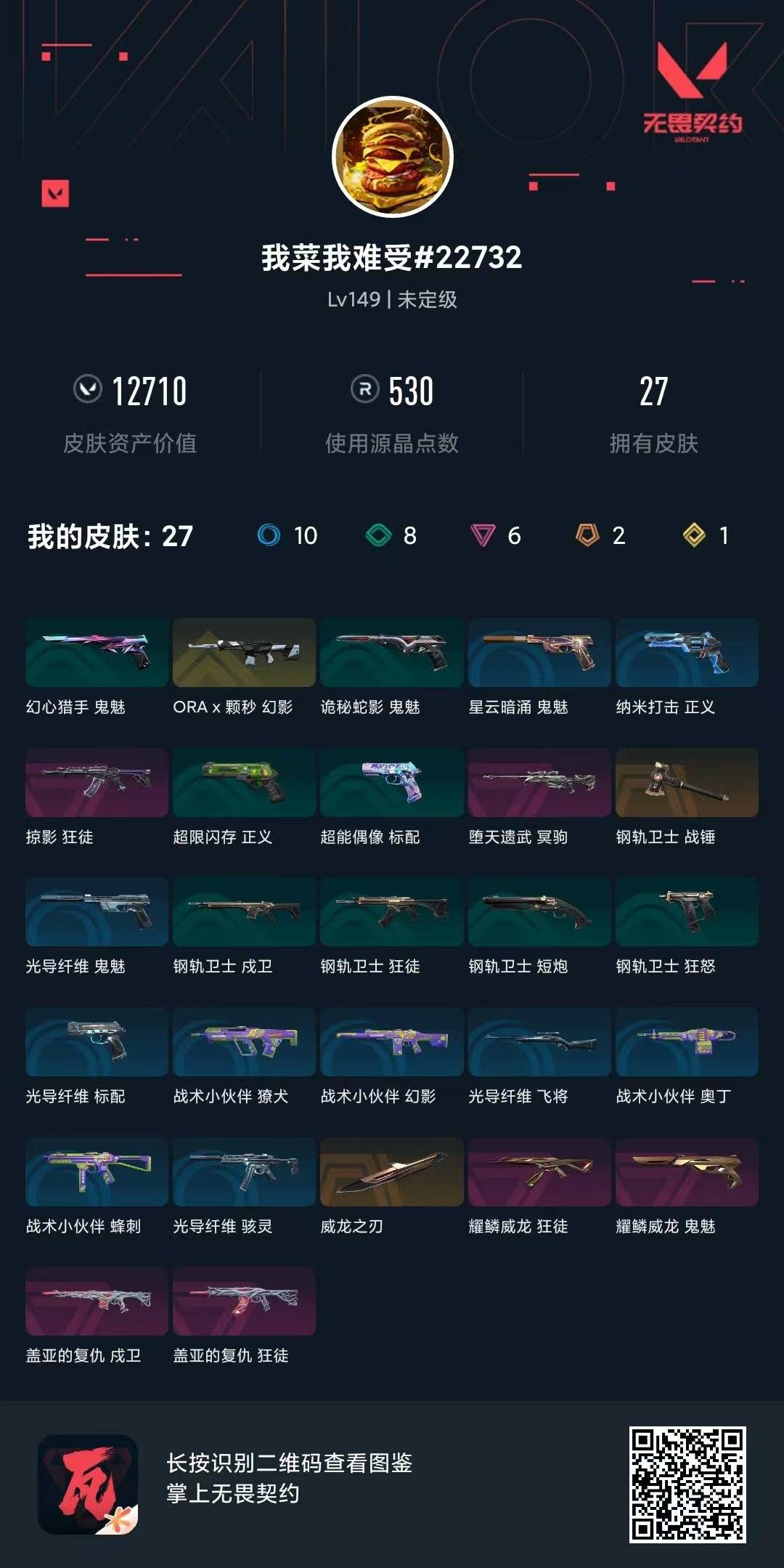 [16458030]2橙皮 1金皮 6紫皮 27皮肤 28英雄 86卡面 530已用源晶 未定级段位 【套装】耀鳞威龙套装 【近战武器皮肤】战锤-钢轨卫士威龙之刃 【佩呛皮肤】鬼魅-耀鳞威龙 【步呛皮肤】狂徒-掠影幻影-ax颗秒狂徒-盖亚的复仇狂徒-耀鳞威龙戍卫-盖亚的复仇 【狙击呛皮肤】冥驹-堕天遗武 【挂饰】袖珍捷风挂饰神中神挂饰传世莲华挂饰耀鳞威龙挂饰双城之战魄罗挂饰糖葫芦挂饰鱼骨头挂饰双城之战小蛋糕挂饰终章ko小金人挂饰飞刀挂饰