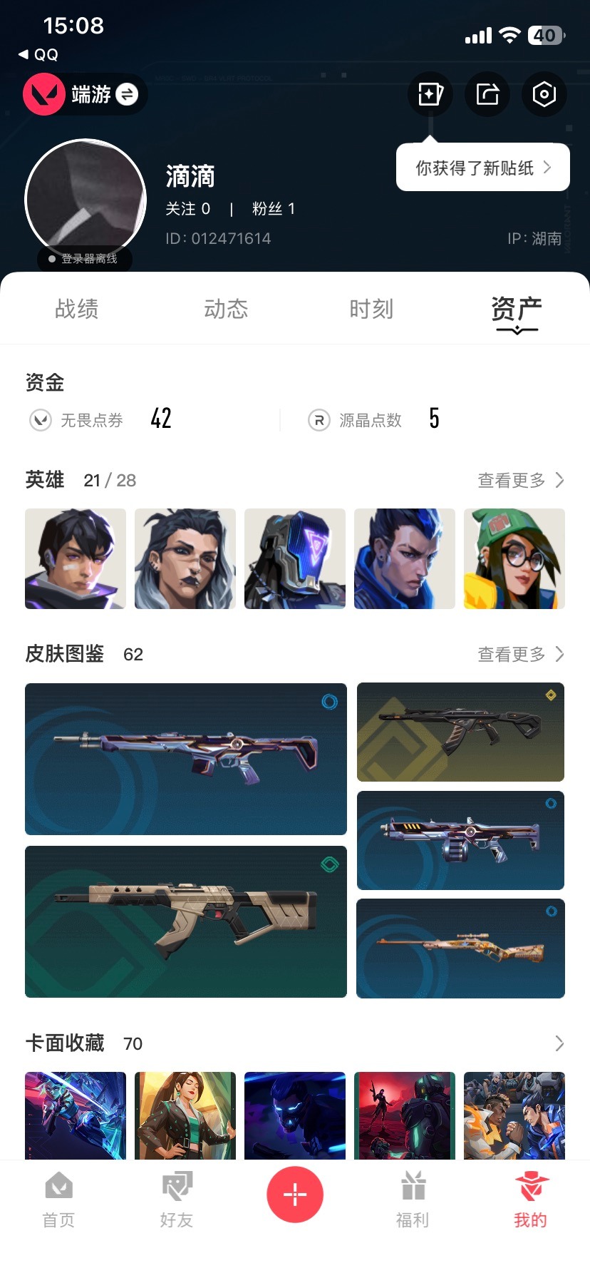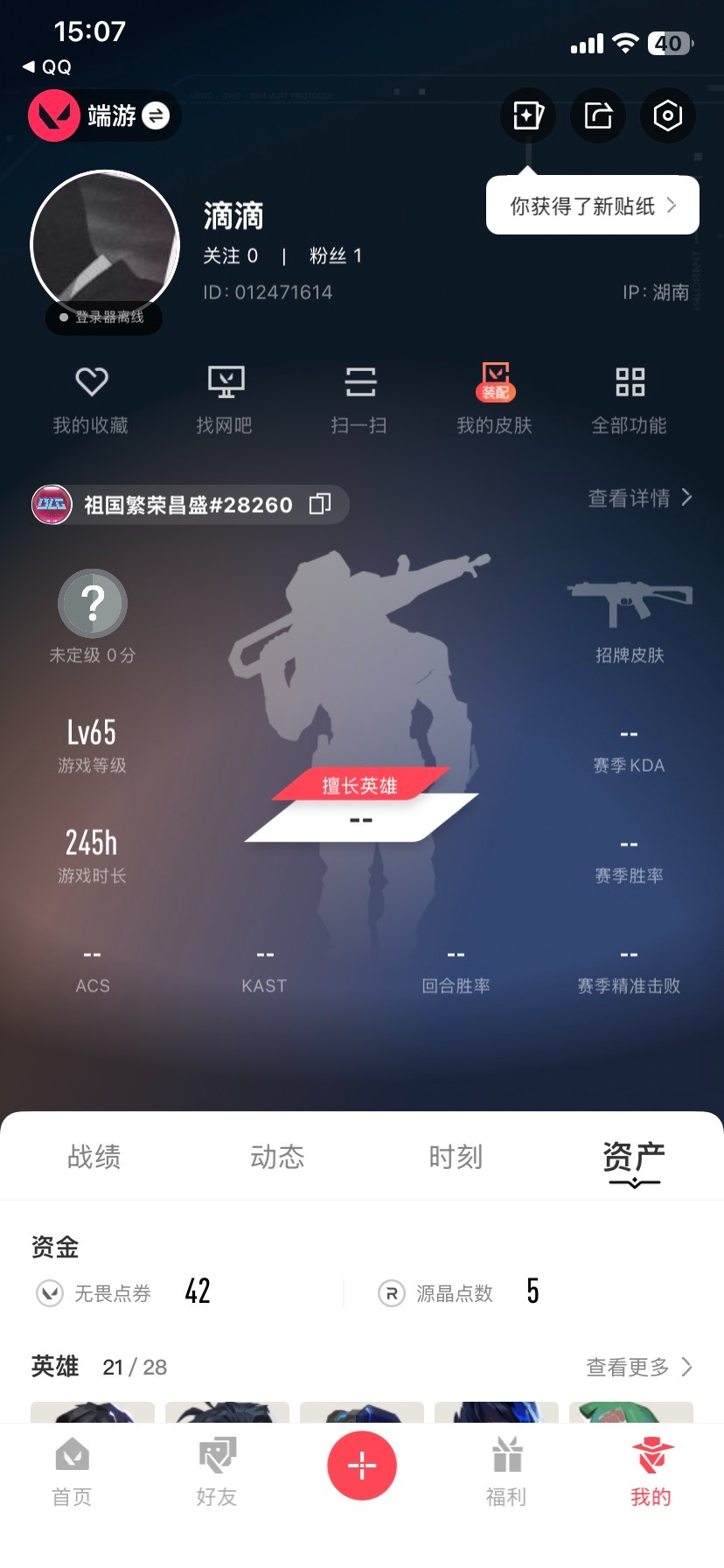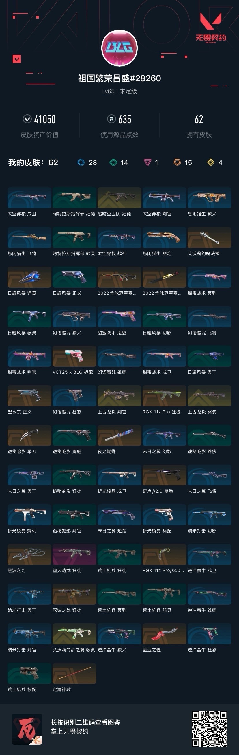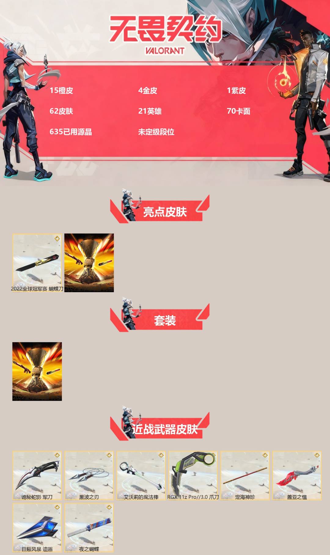 15橙皮 4金皮 1紫皮 62皮肤 21英雄 70卡面 635已用源晶 未定级段位 【亮点皮肤】幻影-2022全球冠军赛蝴蝶刀-2022全球冠军赛 【套装】2022全球冠军赛 【近战武器皮肤】日耀风暴 遗器诡秘蛇影黑波之刃艾沃莉的魔法棒爪刀-rgx 11z pro 3.0盖亚之愠定海