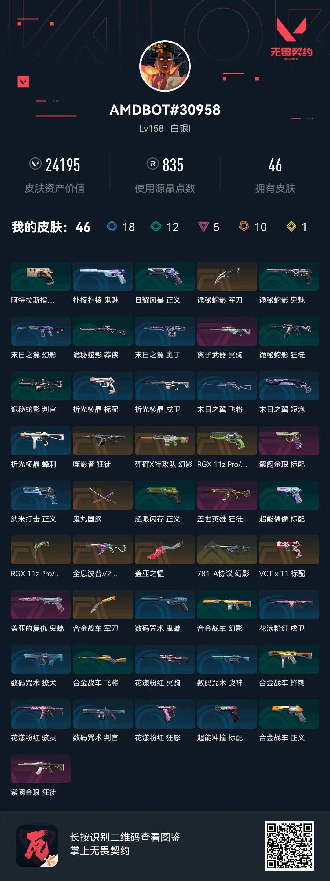 10橙皮 1金皮 5紫皮 46皮肤 28英雄 108卡面 835已用源晶 白银段位 【近战武器皮肤】军刀-合金战车诡秘蛇影爪刀-rgx 11z pro 3.0鬼丸国纲盖亚之愠 【佩呛皮肤】正义-rgx 11z pro 3.0标配-紫阙金琅鬼魅-盖亚的复仇标配-vctxt1 【步呛