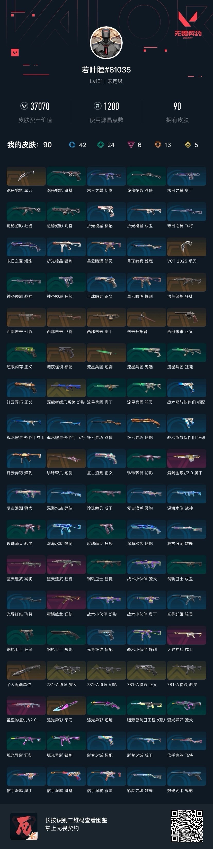 [16465480]13橙皮 5金皮 6紫皮 90皮肤 28英雄 115卡面 1200已用源晶 未定级段位 【套装】vctcn2025套装西部未来vct 2025赛季礼包781-a协议套装 【近战武器皮肤】短剑-流星兵团诡秘蛇影vct 2025 爪刀未来开拓者个人近战单位短剑-珍珠棘贝军刀-弧光异彩 【佩呛皮肤】正义-西部未来标配-黯夜怪谈正义-781-a协议 【冲锋呛皮肤】骇灵-781-a协议 【步呛皮肤】幻影-西部未来狂徒-洪荒怒焰狂徒-耀鳞威龙狂徒-堕天遗武幻影-781-a协议幻影-源能者娱乐系统戍卫-天界神兵獠犬-781-a协议 【狙击呛皮肤】飞将-西部未来冥驹-堕天遗武 【机呛皮肤】奥丁-西部未来奥丁-紫阙金琅2.0战神-盖亚的复仇2.0 【挂饰】袖珍捷风挂饰vct2025太平洋联赛挂饰vct2025美洲联赛挂饰vct2025emea联赛挂饰西部未来挂饰神中神挂饰传世莲华挂饰vct2025cn联赛挂饰金属蝶翼挂饰云开见日挂饰鱼骨头挂饰终章ko小金人挂饰迷你机甲挂饰