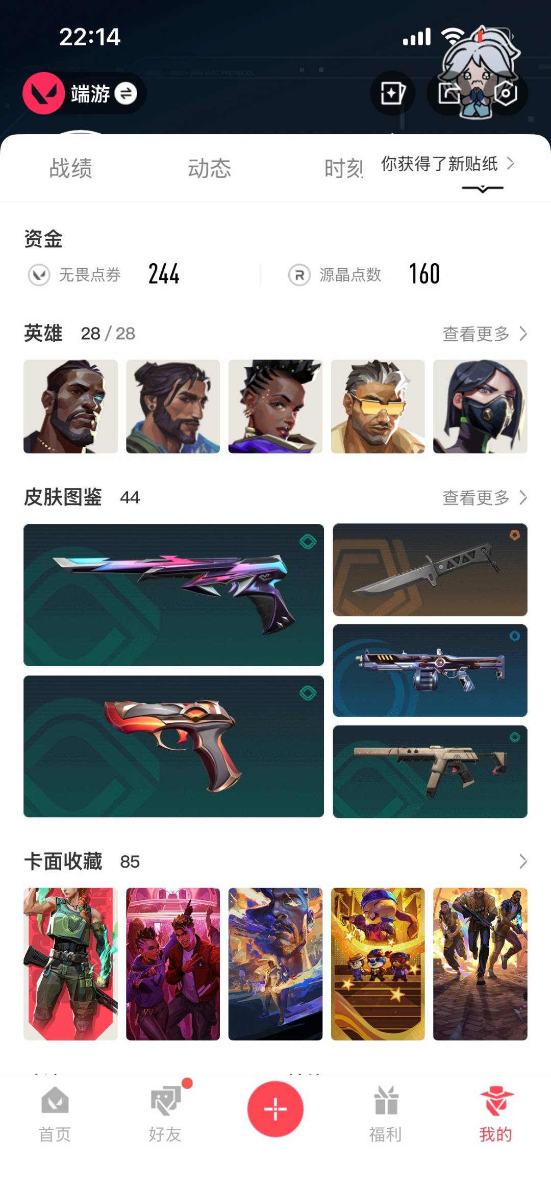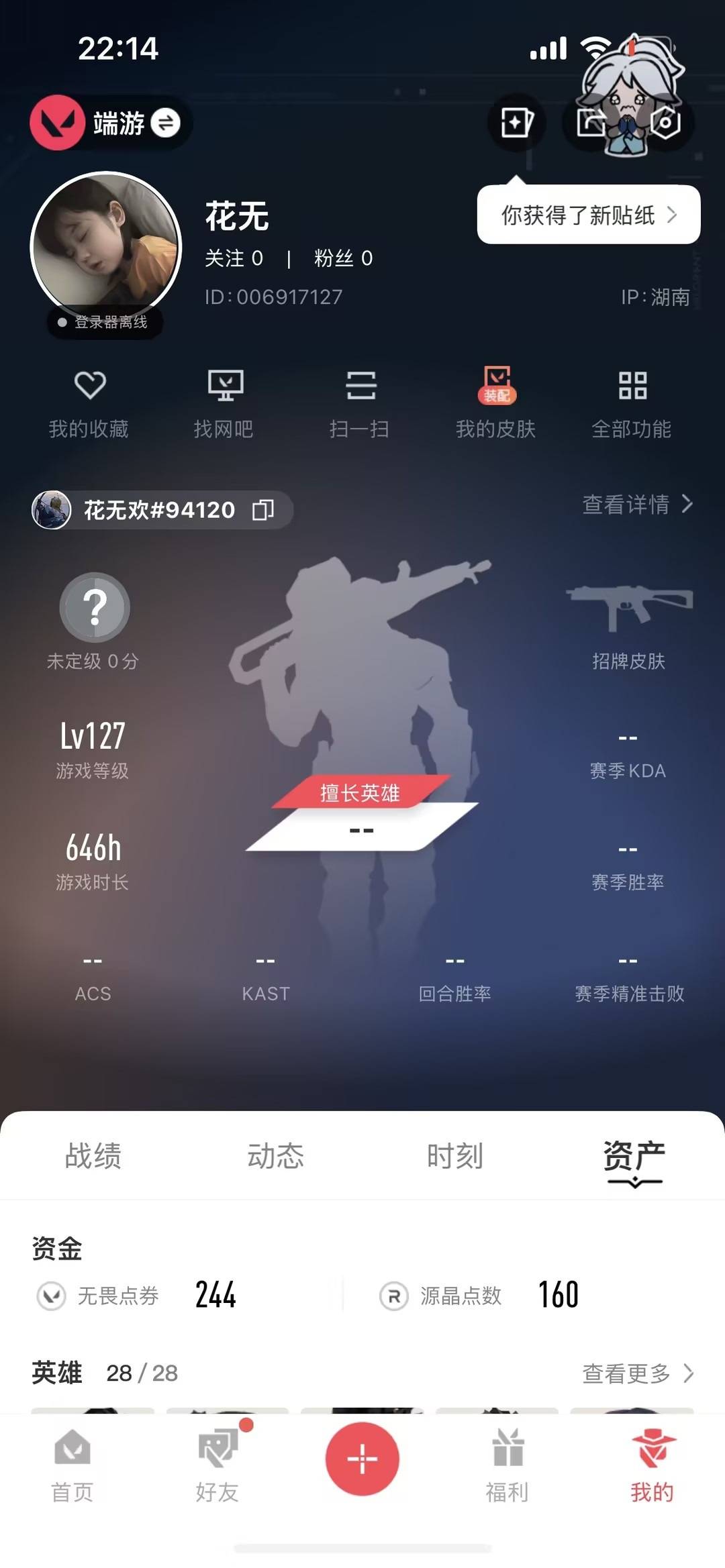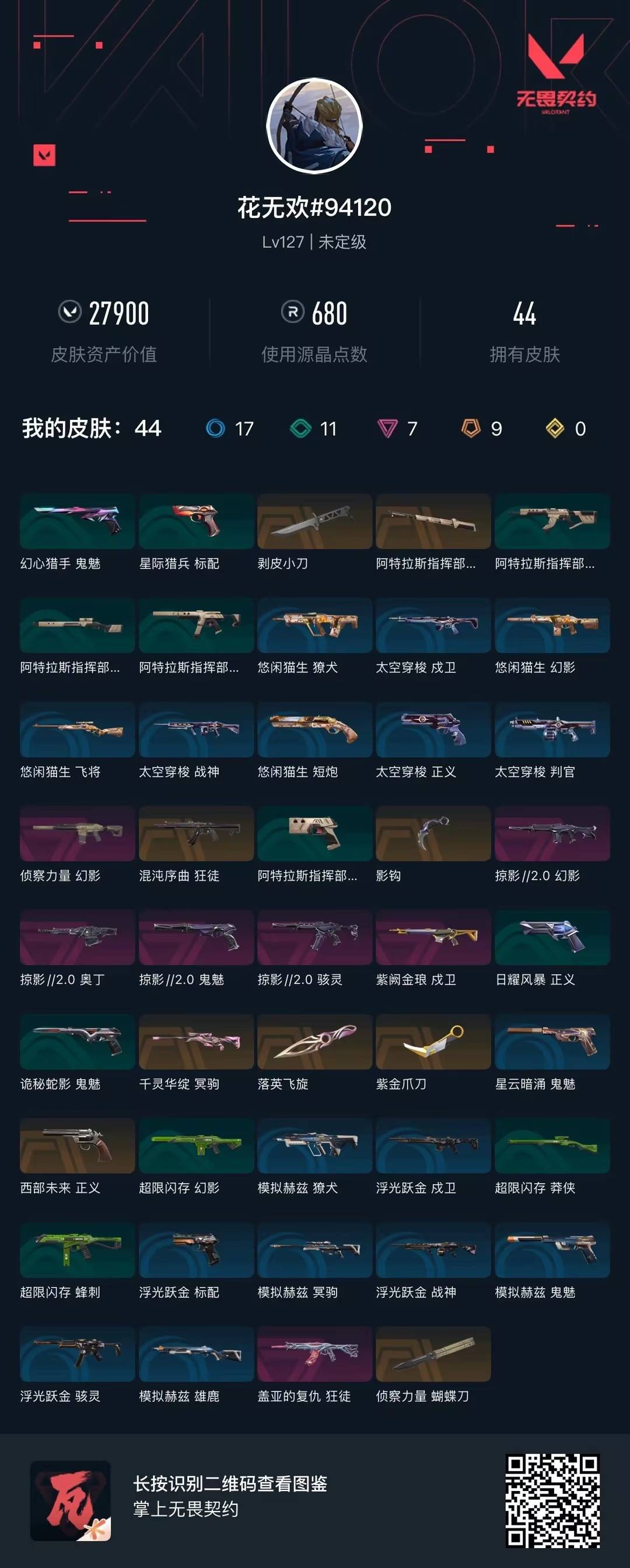 9橙皮 7紫皮 44皮肤 28英雄 85卡面 680已用源晶 未定级段位 【套装】掠影2.0套装 【近战武器皮肤】阿特拉斯指挥部影钩蝴蝶刀-侦察力量剥皮小刀紫金爪刀落英飞旋 【佩呛皮肤】正义-西部未来鬼魅-掠影2.0 【冲锋呛皮肤】骇灵-掠影2.0 【步呛皮肤】幻影-掠影2.0狂徒-