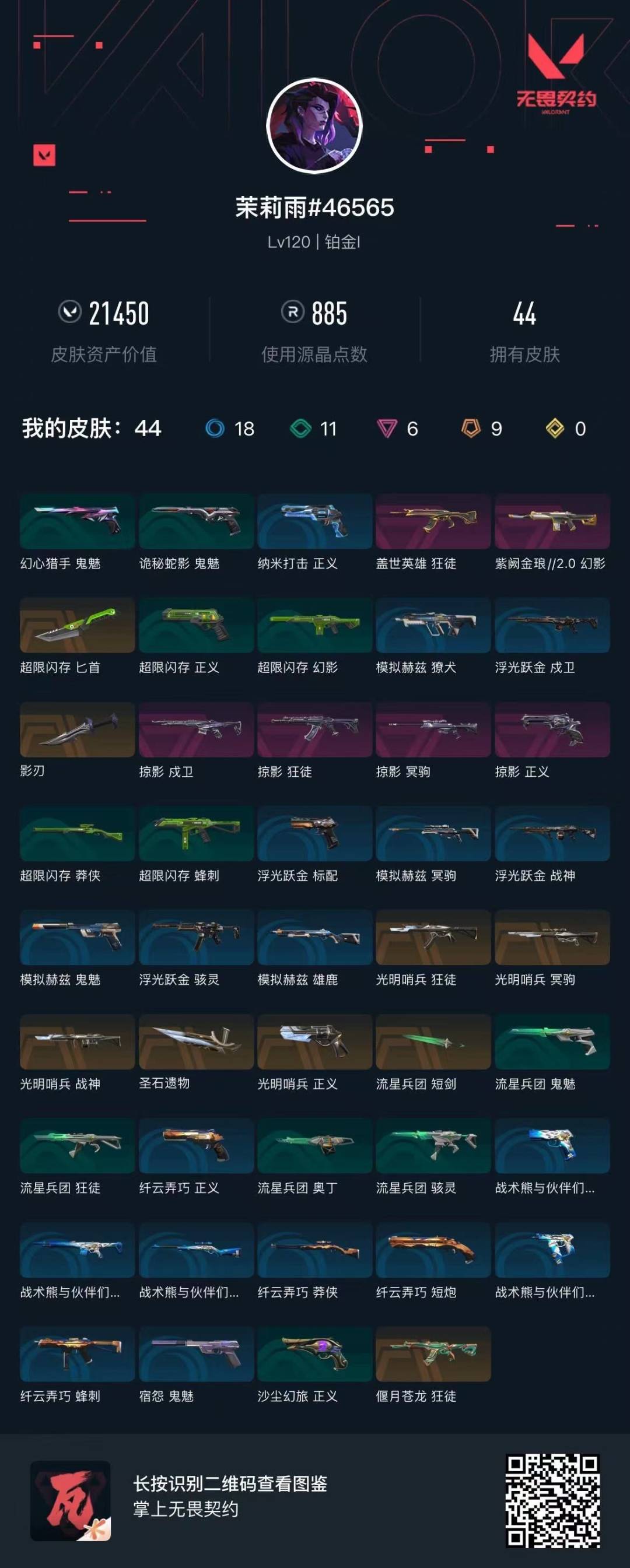 9橙皮 6紫皮 44皮肤 27英雄 89卡面 885已用源晶 铂金段位 【套装】:光明哨兵1.0套装掠影套装 【近战武器皮肤】:圣石遗物匕首-超限闪存短剑-流星兵团影刃 【佩呛皮肤】:正义-光明哨兵正义-掠影 【步呛皮肤】:狂徒-光明哨兵戍卫-掠影狂徒-掠影狂徒-偃月苍龙狂徒-盖