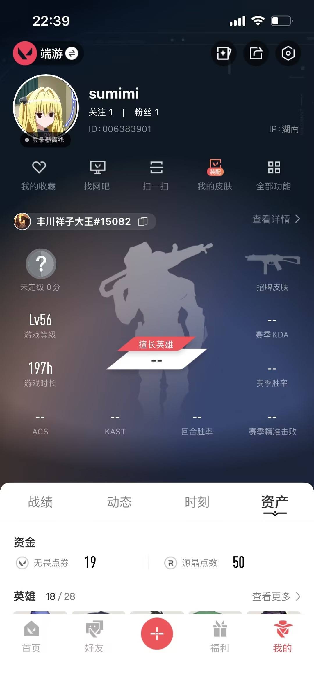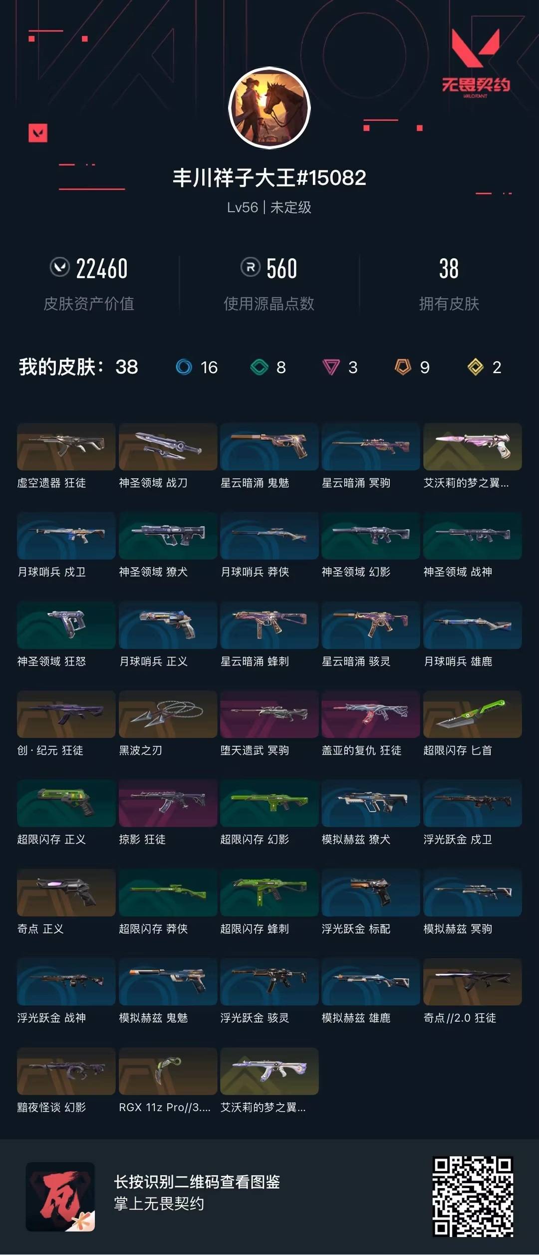 9橙皮 2金皮 3紫皮 38皮肤 18英雄 65卡面 560已用源晶 未定级段位 【近战武器皮肤】匕首-超限闪存神圣领域 战刀黑波之刃爪刀-rgx 11z pro 3.0 【佩呛皮肤】正义-奇点鬼魅-艾沃莉的梦之翼 【步呛皮肤】狂徒-虚空遗器狂徒-创·纪元狂徒-掠影狂徒-奇点//2.